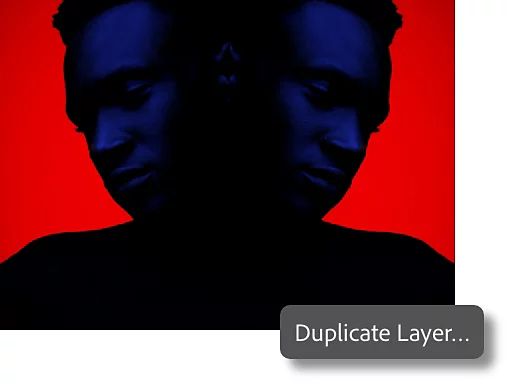 원본 이미지 옆에 좌우가 반전된 이미지를 배치하여 인상적이고 대칭적인 디자인을 만들어 보세요. 이미지의 배경 레이어를 마우스 오른쪽 버튼으로 클릭한 후 '레이어 복제'를 선택하면 뒤집을 수 있는 이미지 사본이 생성됩니다.