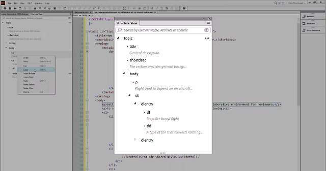 Leverage the new, intuitive Structure View while working on content in XML or source code view. Use the powerful search functionality to locate content, elements, or attributes. Cut, copy, paste, and more using the context menu.