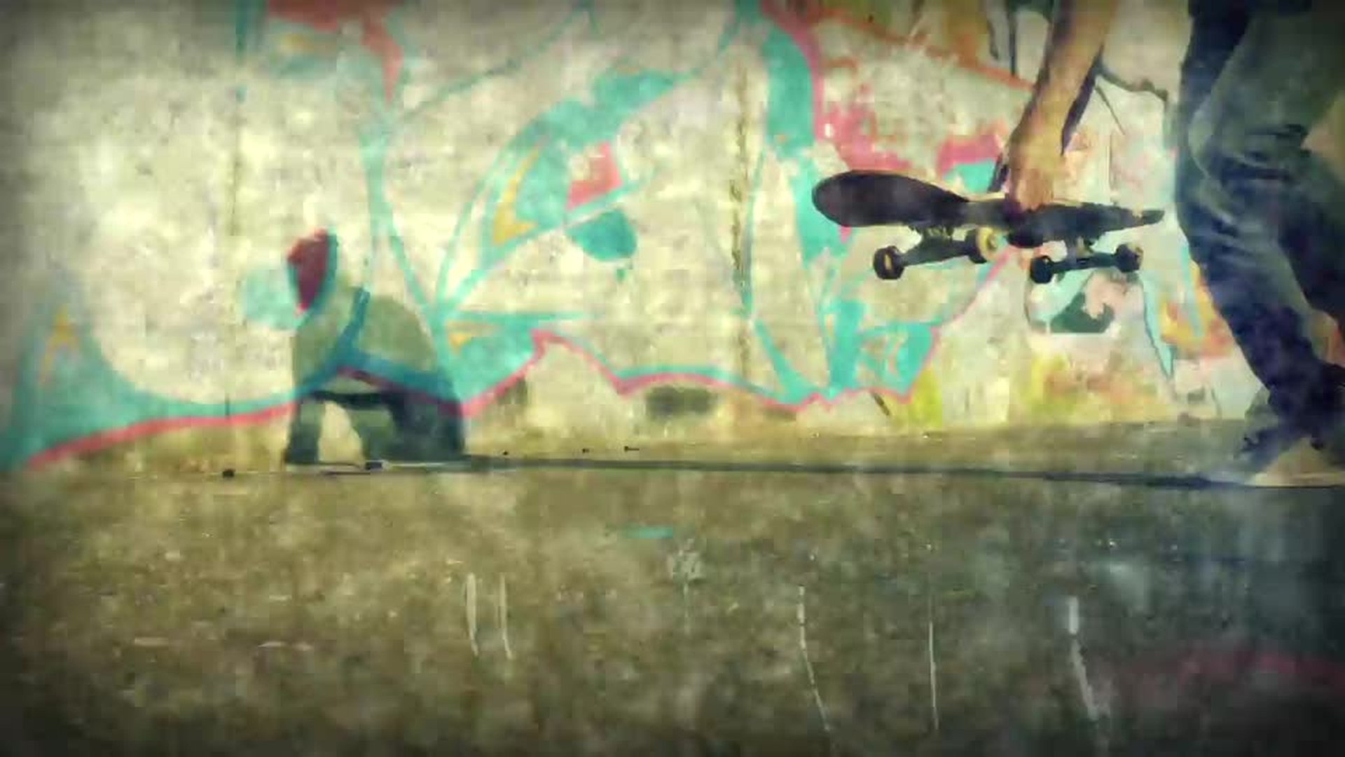Now that you’ve got an interesting grunge look, apply it to some footage by dragging a clip to the bottom of the Timeline. You can reference the skateboarder clip in our sample file or use your own. Play around with the various blending modes of the Turbulent Noise layers (especially Add, Darken, Multiply, and Overlay) to see how the combined effect impacts the scene.