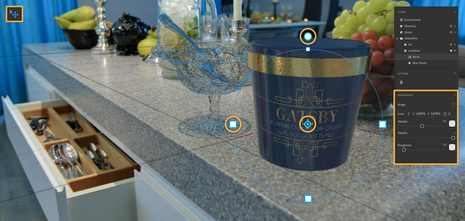 To refine the container’s appearance, expand GelatoPint in the Scene panel. Select Blue Plastic. You can change material attributes such as Base Color, Glow, and Roughness in the Properties panel below the Scene panel.