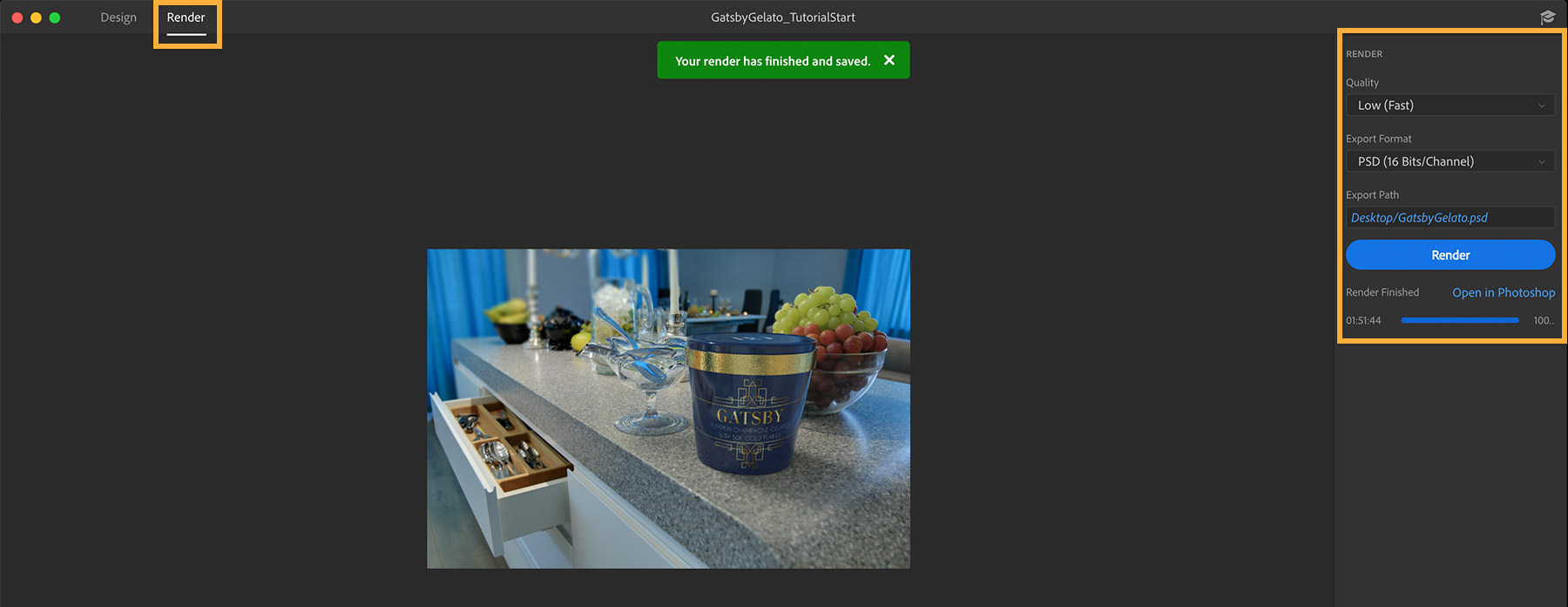 Click the Render tab at the top. Specify the quality setting, choose an export format, and add a destination for the file. Click Render. We selected Low (Fast) quality and the PSD format. When the rendering is complete, click Open in Photoshop.