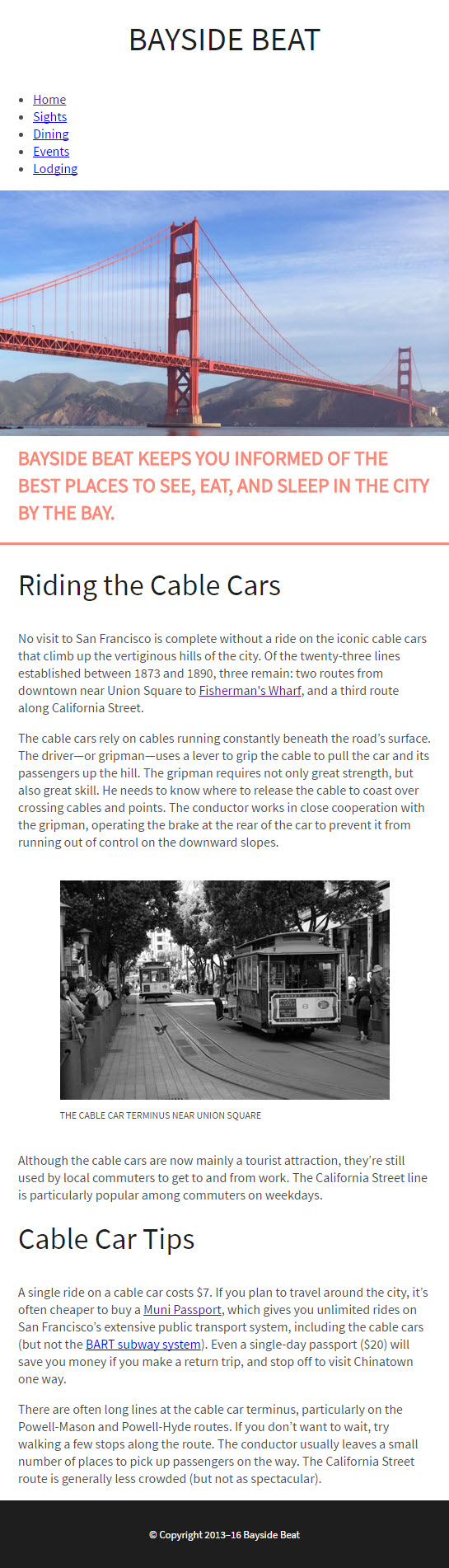 In the previous section, you styled the image of the cable car differently from the hero image by assigning it a class. However, it’s not always necessary to use a class to style elements differently. The paragraph between the image of the Golden Gate Bridge and the first < h2> heading is nested inside the hero < div> , so it can be styled differently from all other paragraphs by creating a descendant selector for #hero p .