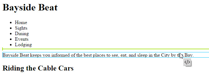 Source Code in the Related Files toolbar. Then in Live View, select the second paragraph after the heading "Riding the Cable Cars." It begins with the words "The cable cars rely…"