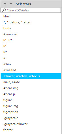 In Live View, hover over a link. It should turn to burnt orange and be underlined. If it doesn’t, it probably means your link styles are in the wrong order in the Selectors pane. Compare your version with Figure 1.