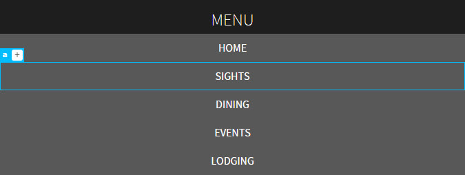 Pressing the up arrow key while the focus is in Live View moves the selection up the HTML hierarchy. If you select a list item in the middle of the list, pressing up once selects the < a> tag (the hyperlink) of the list item immediately above. Pressing up again then selects the < li> tag, which is the link's parent element. As you continue pressing, Dreamweaver climbs up the hierarchy. If you go too far, Dreamweaver will select the < nav> element, then the < h1> element. Press the down arrow to get back to the < ul> element.