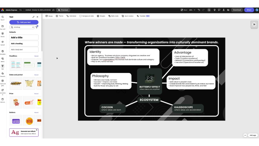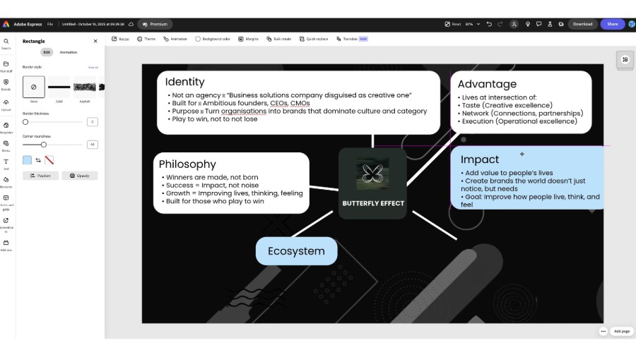 You can see how Elfried used the name Butterfly Effect as his centrepiece, the message that ties his brand story together.