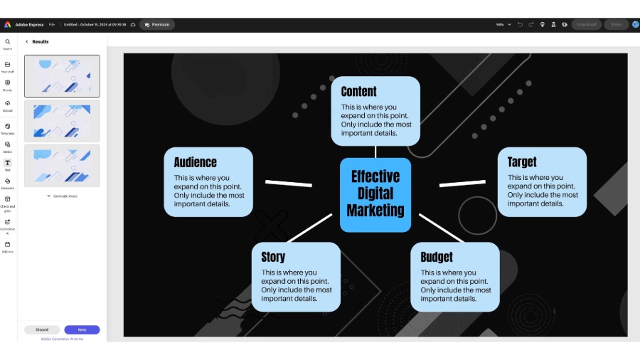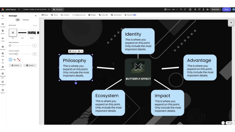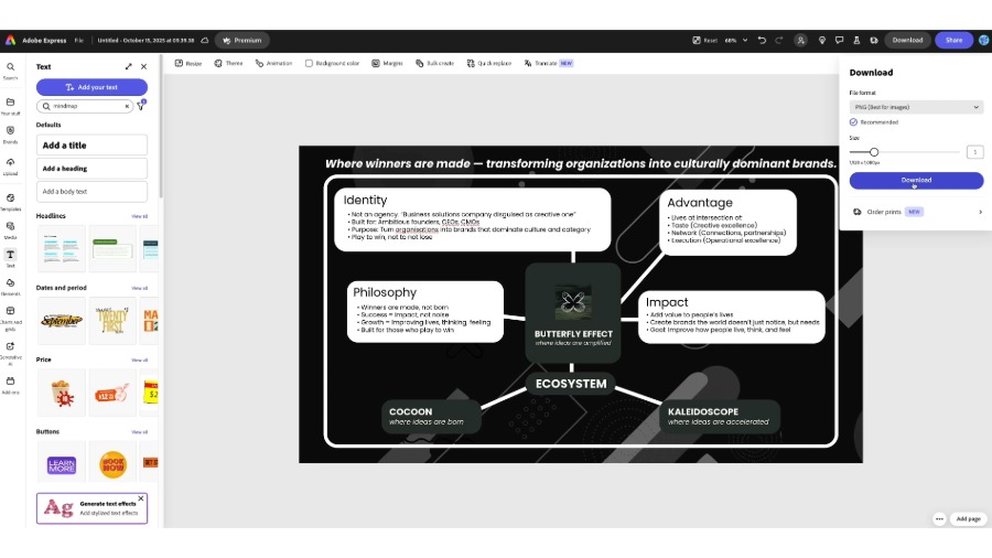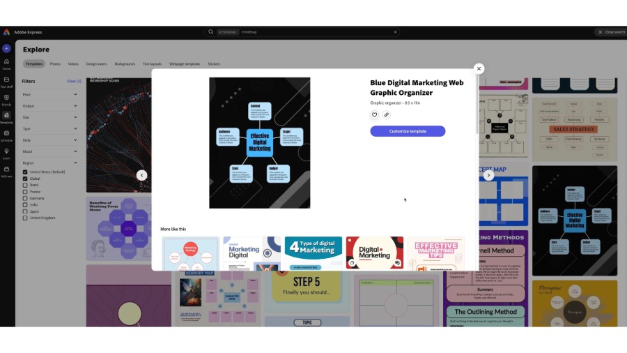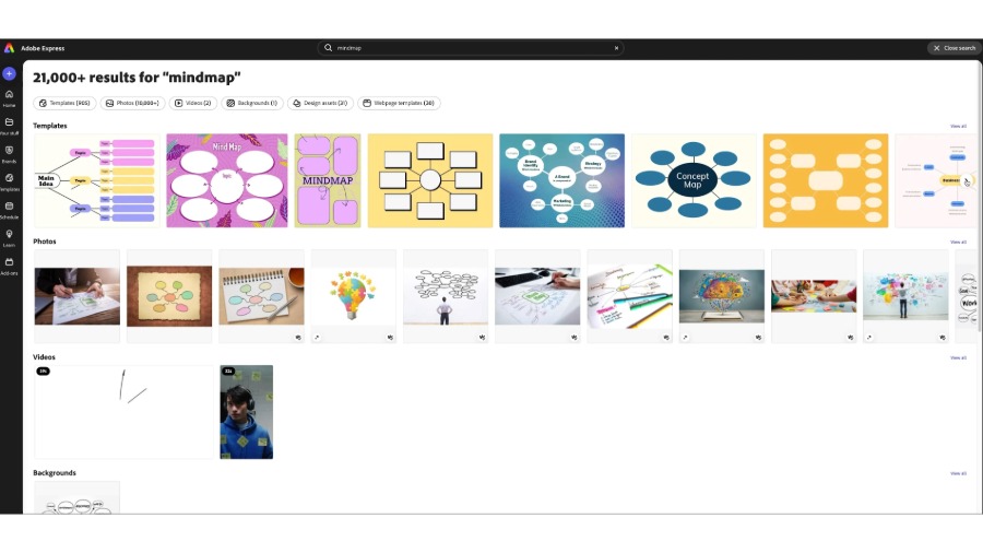 From the Adobe Express home page, you can select Start from your content to begin with your design, or you can pick from thousands of templates that are completely customisable. Select Templates from the left panel and search ‘mindmap’ to browse the range of templates designed to help you map ideas and connect themes.