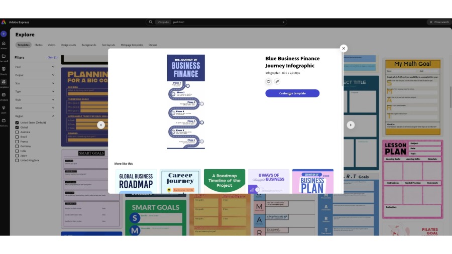 Search for templates such as goal sheet, vision board, or journey infographic. These templates are designed to help map big ideas visually.