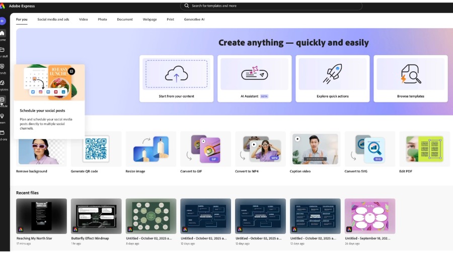 From the Adobe Express homepage, click the Schedule icon on the left panel.