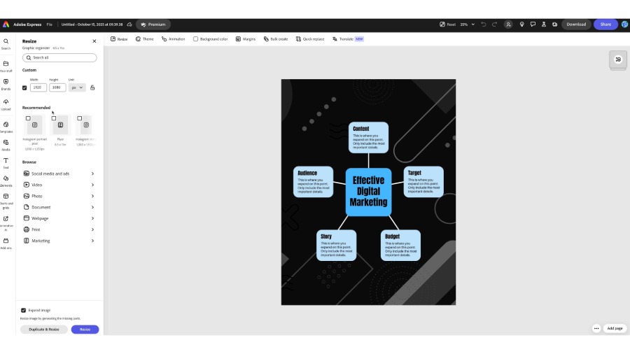 If you want to adapt your framework for another format, click Resize at the top of the workspace. Choose from preset sizes like Instagram post, flyer or presentation, or enter custom dimensions.
