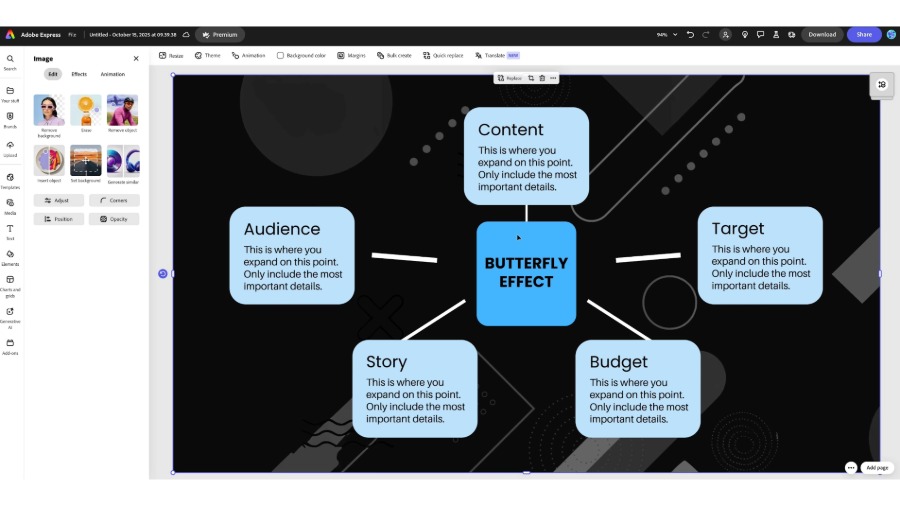 Once loaded, the project opens in the Adobe Express editor where all adjustments happen. Here you can resize, recolour, add text or replace elements to make the design feel original.