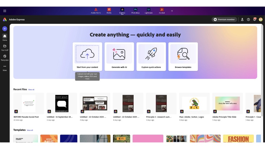 From the Adobe Express home page, select Start from your content and upload your video. You’ll land in the editor, ready to adapt your footage for different platforms.