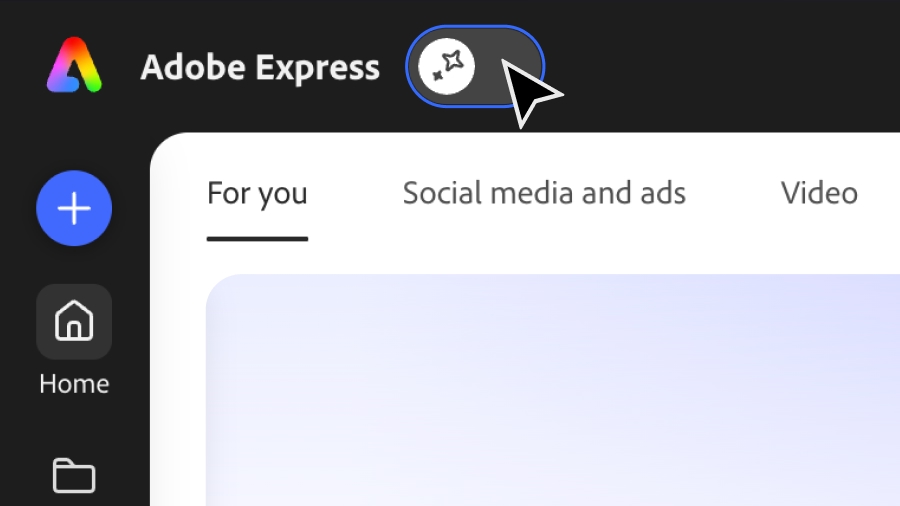Select AI Assistant (beta) from the Adobe Express homepage and turn on the toggle. Note: If you already have a design in progress, you may also toggle on AI Assistant from the Editor.