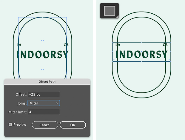 With the shape still selected, choose Object > Path > Offset Path. Set the Offset value to create an inner oval. Then choose the Rectangle tool, and drag it to draw a rectangle around the words in the design.