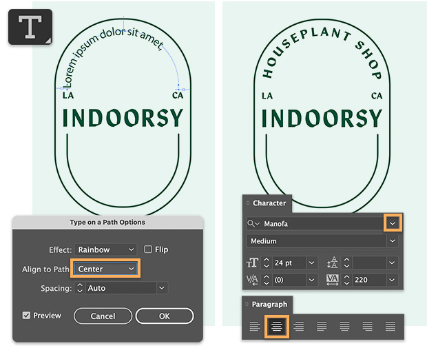 Choose the Type tool and click on the leftmost part of the path. Double-click the Type tool to set the alignment. Use the Character and Paragraph panels to choose a font — we activatedManofa from Adobe Fonts — and fine-tune your layout.