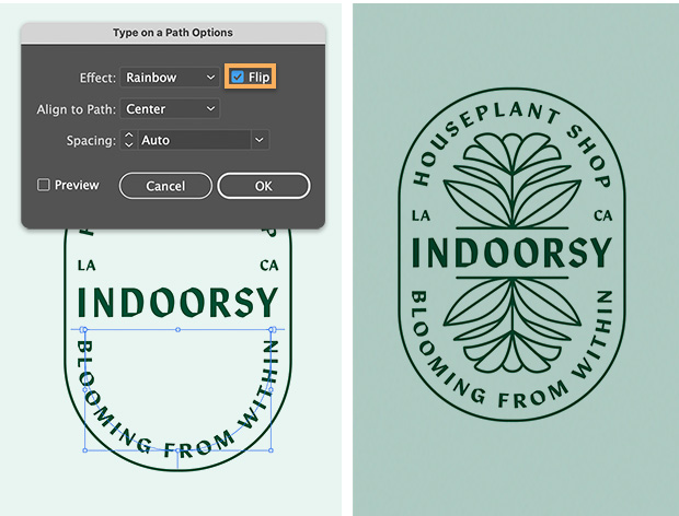 Add a new message to the bottom of the design, starting from the opposite direction. Double-click the Type on a Path tool to set the alignment, and flip the type for better readability. Finish your design by dragging the flower artwork into the logo.