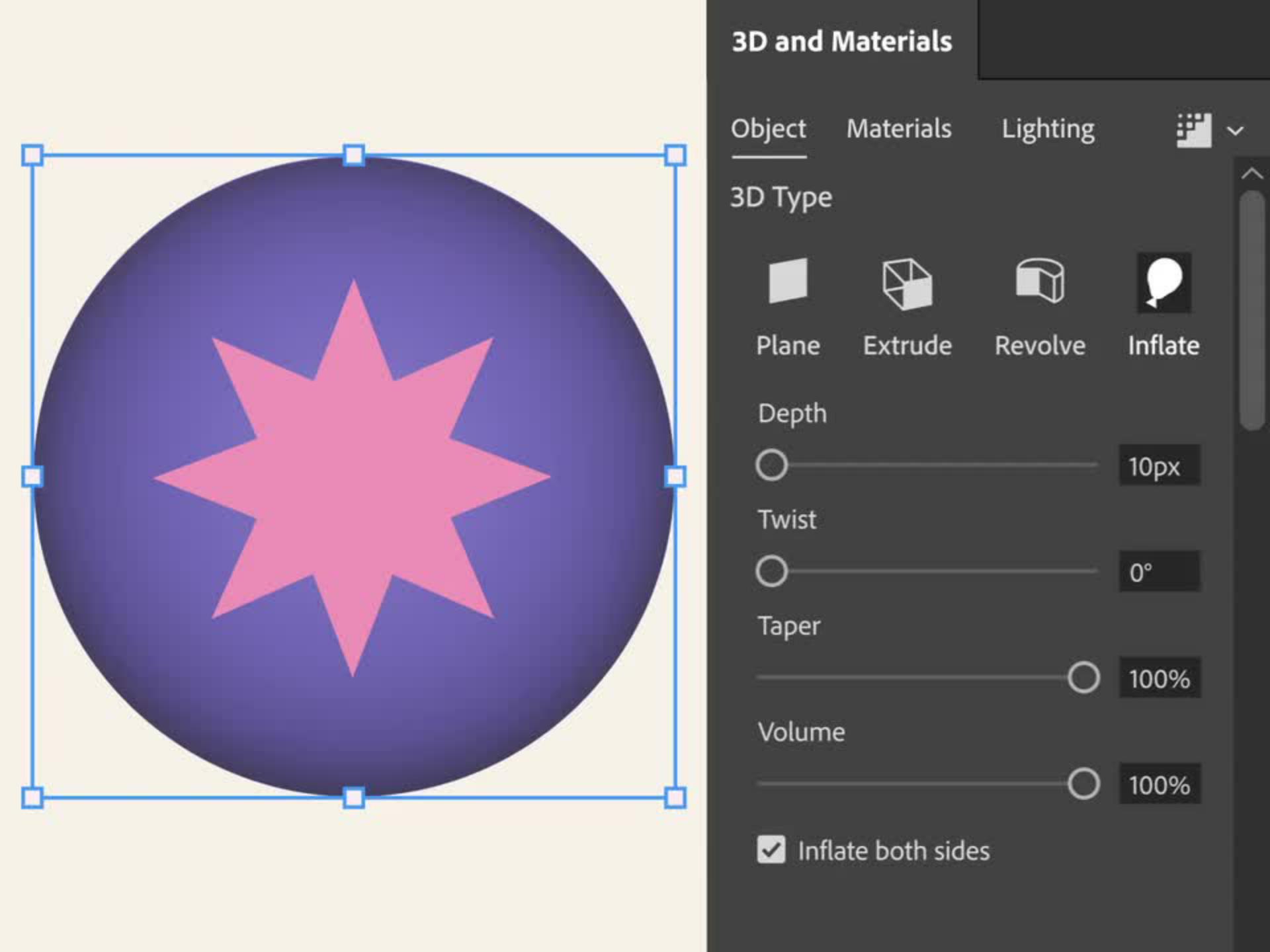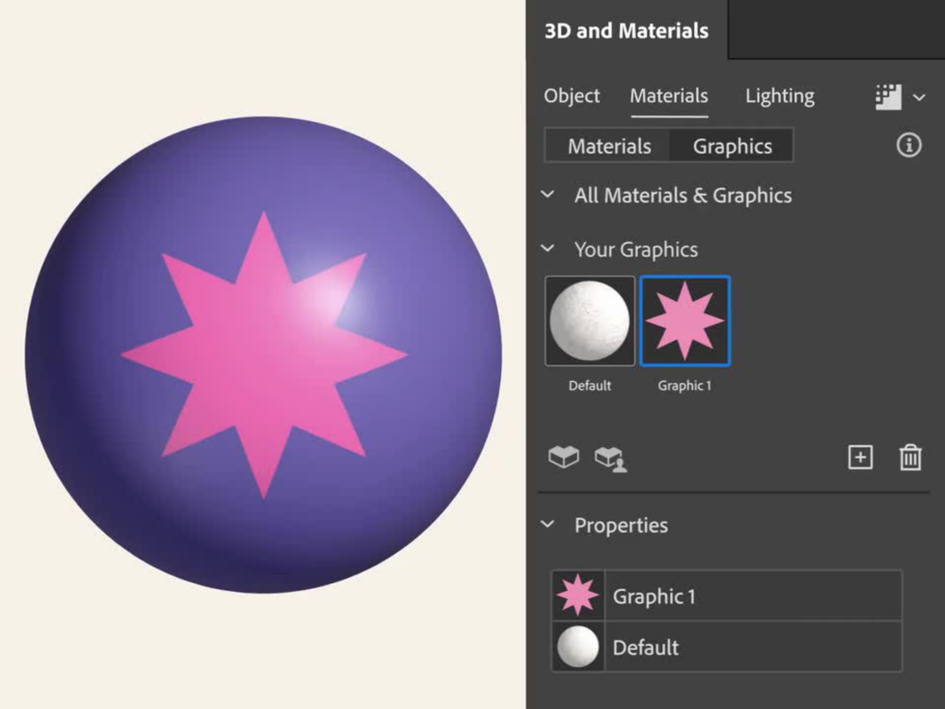 Choose the Materials tab and then select the star. Click the Add Materials (+) button and choose Add as Single Graphic. Select the circle and click the newly added star graphic to use it as a material for your 3D object. Then delete the original star.