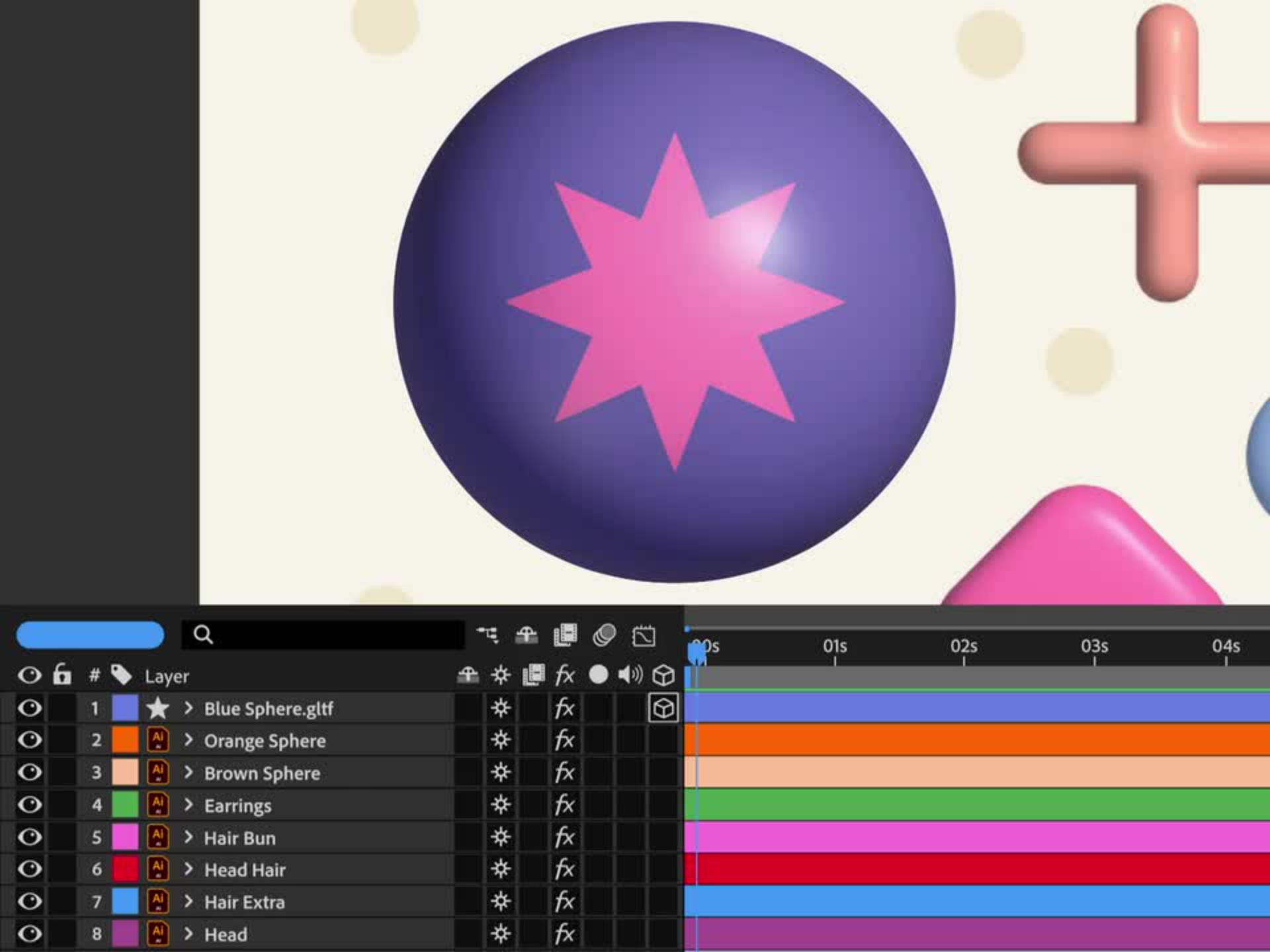 Drag the GLTF object onto the timeline. Resize and reposition it as necessary and then delete the sphere layer (from the .ai file). Once the object is in the correct position, right-click it and choose Transform > Auto Orient > Orient towards Camera to have the graphic facing forward.