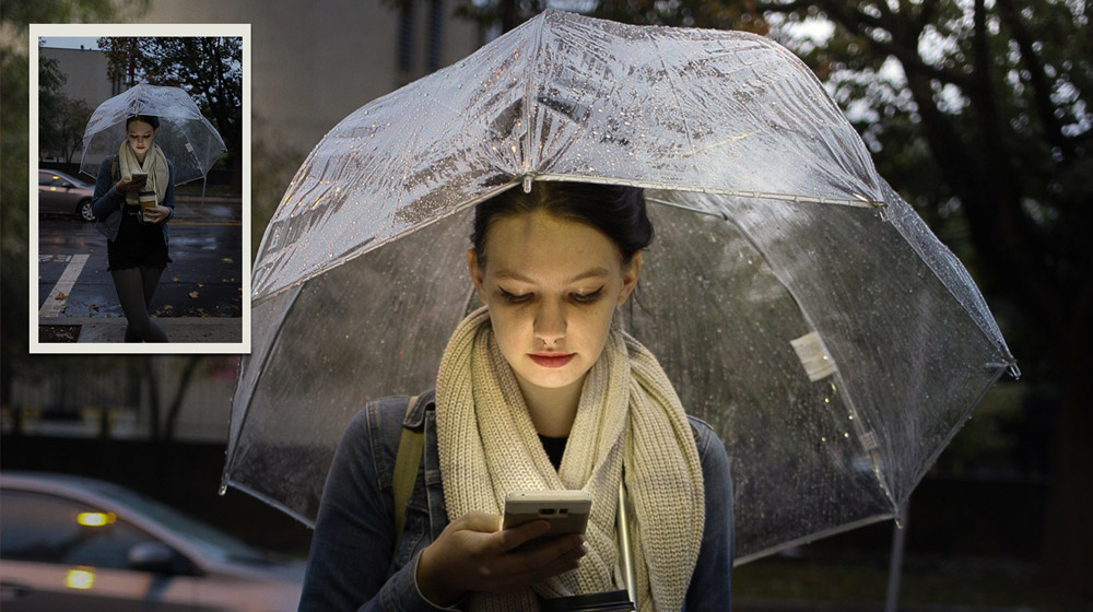 Edit the photo to make it appear as though the light from the phone illuminates the model’s face, while also shedding some light on her umbrella. To do this, lighten (or dodge) areas that are too dark.