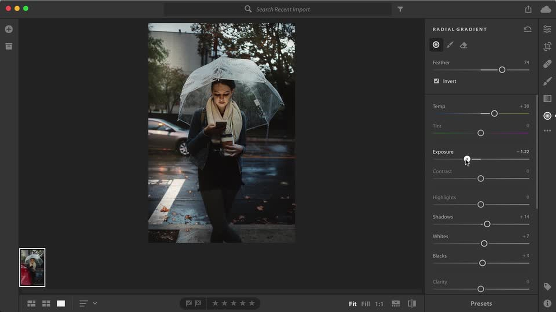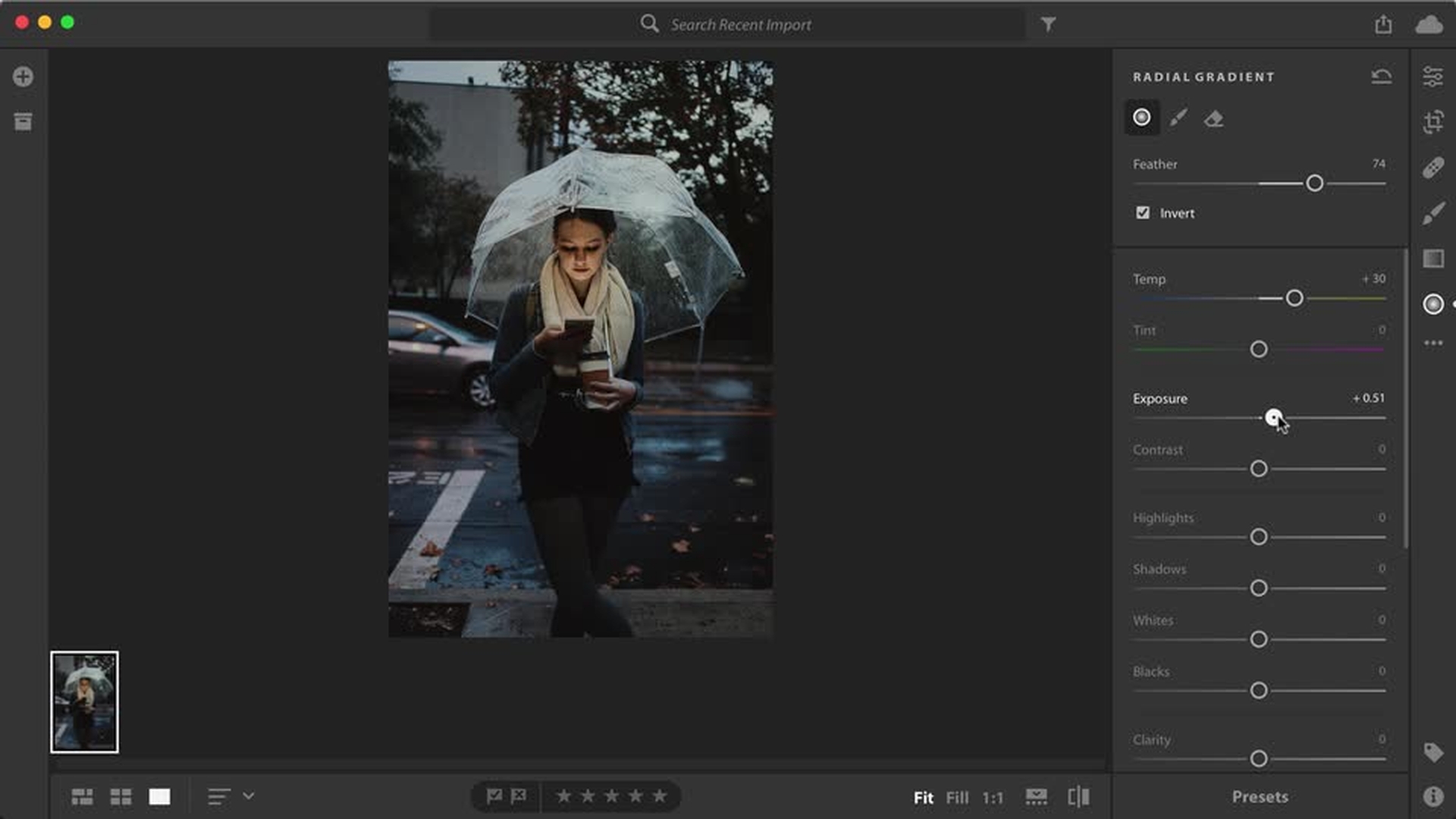 Add a Radial Gradient and resize it to include the car and the street to the left of the model. Then, lower the Exposure.