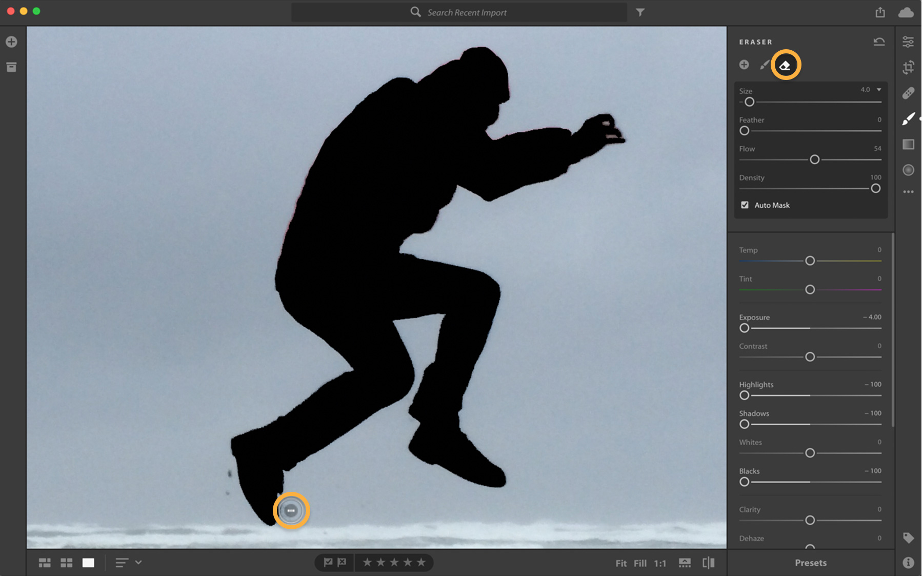 Highlight the person in the photo using the Brush tool with Auto Mask enabled. Auto Mask detects the edges of an object in an image by sampling the colors and tones where you start brushing. This will help you brush over the person without including unintended areas.