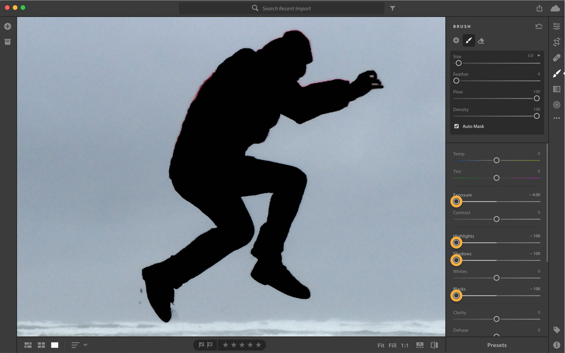 Sample settings: Exposure: -4.00; Highlights: -100; Shadows: -100; Blacks: -100