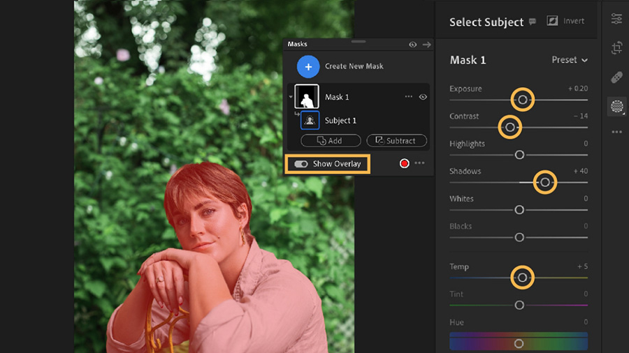 Click the Masking button and choose Select Subject. Lightroom will automatically create a new mask over the model.