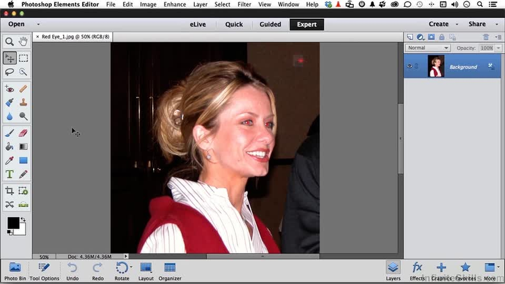 (Photoshop Elements 13) Learn how to quickly correct "red eye" that is common photos taken with a flash. Also, learn how to remove wrinkles and imperfections.