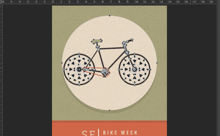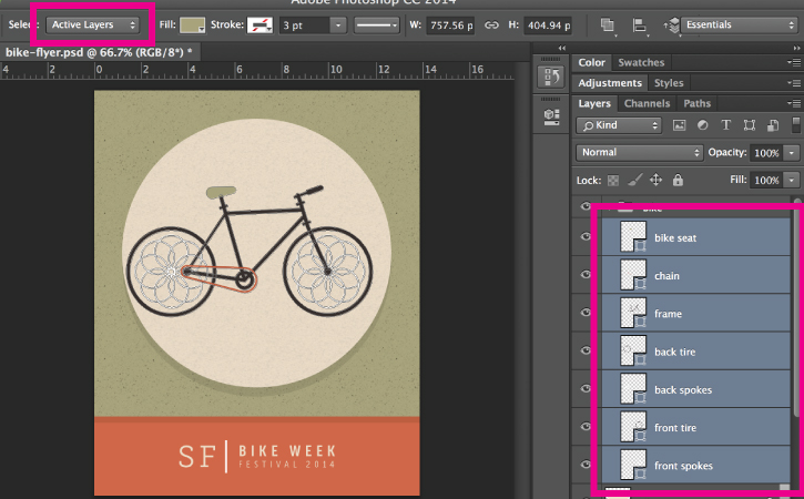 When an image has many layers, sometimes it's helpful to isolate only the shapes or paths you want to edit. Let's isolate the paths that make up the bike. In the Layers panel, click to select the "bike seat" layer. Click Shift and select the "front spokes" layer in the Layer panel. This selects the two layers and all the layers in between them. Now you have made all of the bike shape layers active.