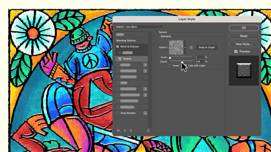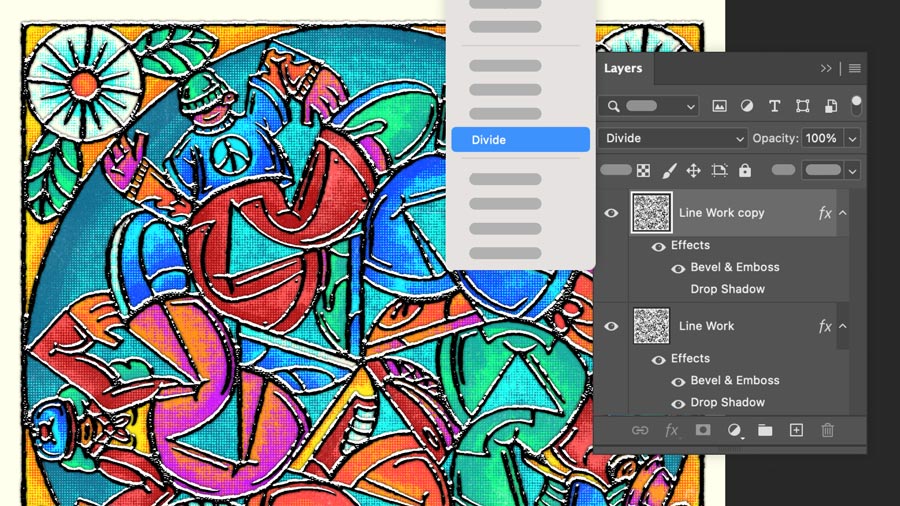 Create more defined highlights by duplicating your Line Work layer. In the Layers panel, drag it to the + sign, then change the Blending Mode of the duplicate to Divide, and toggle off the Drop Shadow. Keep playing with colors, textures, and gradients to make it your own.