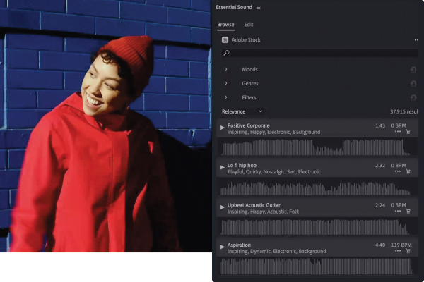 Within the Essential Sound panel, search by keyword, mood, or genre to find tracks on Adobe Stock. Sample tracks without adding them first to your project.