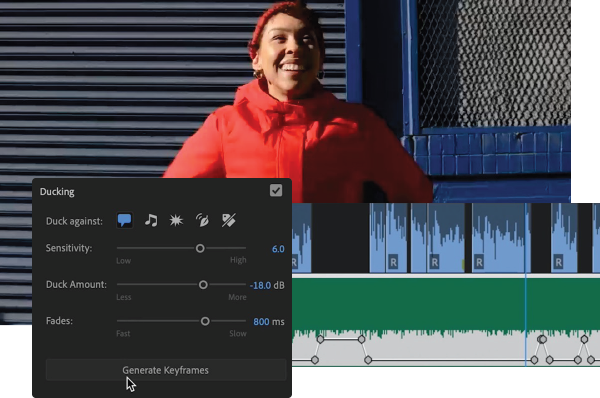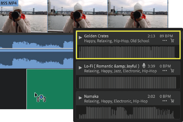 Drag a selection from the Essential Sound panel to an audio track on the timeline to add the asset to your project. License audio with one click.