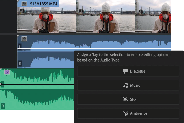 Assign audio as Dialogue, Music, Effects, or Ambience to reveal effects, presets, and adjustments specific to that audio type.