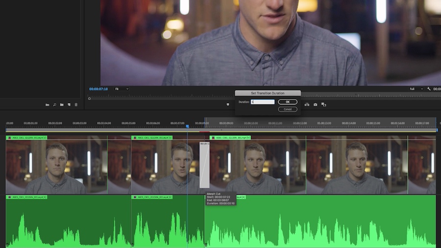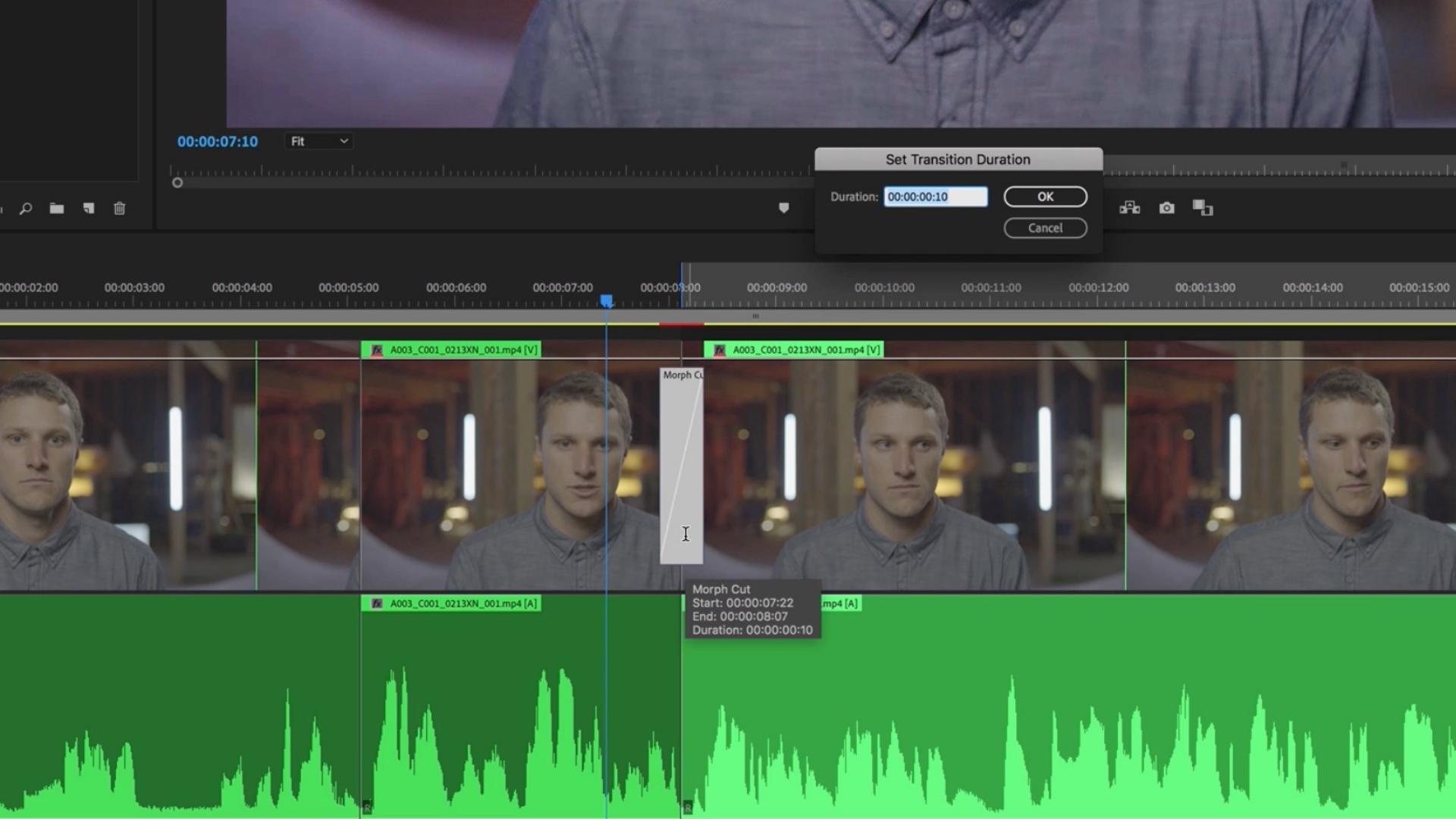 From the Effects panel, drag the Morph Cut transition effect onto the jump cut edit point and center it.