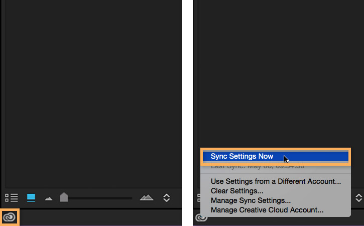 To keep your settings in sync with your Creative Cloud account at any time, click the Creative Cloud icon (left) in the lower left corner of your workspace and choose Sync Settings Now (right).