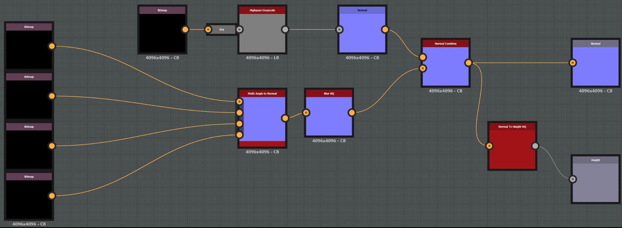 The image above uses four directions to create a normal using the Multi-Angle to Normal. It then applies a Blur High Quality with a minimal amount to reduce noise and avoid introducing too much small detail later on.