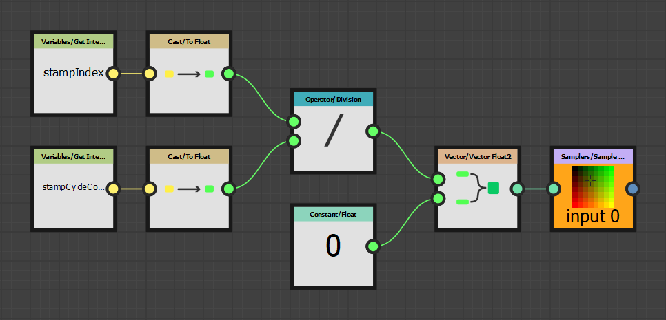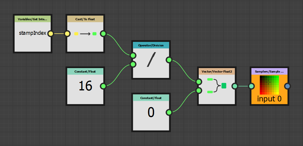 The float node 0.5 has been replaced by the division operation. We get the Stamp Index value and divide it by 16 since this is the maximum value we defined in the Stamp Index input properties earlier. The idea is to get as result a value between 0 and 1 which is what the Sampler node expect as pixel coordinates.