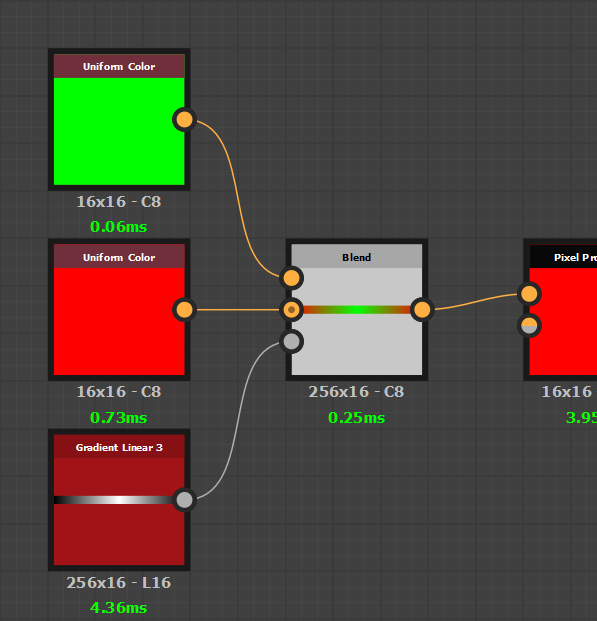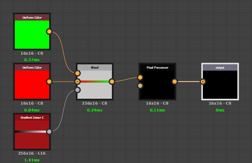 Now to blend the colors we will use a Blend node with a Gradient node as its mask input. Because the Uniform Color nodes are set to custom resolutions, we need to do the same for the blend node and the gradient input. This is why they are both set at 256x16 pixels (with the same method as mentionned above).