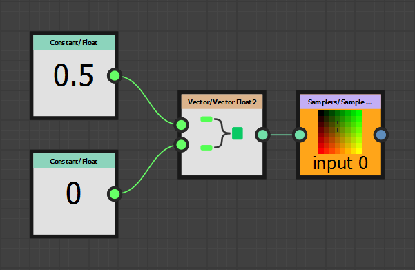 The sample node is used to read the pixels of the input image (the gradient). Instead of feeding the image coordinates we will manually create them. This is why we have two float nodes and a Vector Float 2 node to create the two components of the pixel position. Since the gradient only has relevant information on one axis, the second float node can always be set to 0.