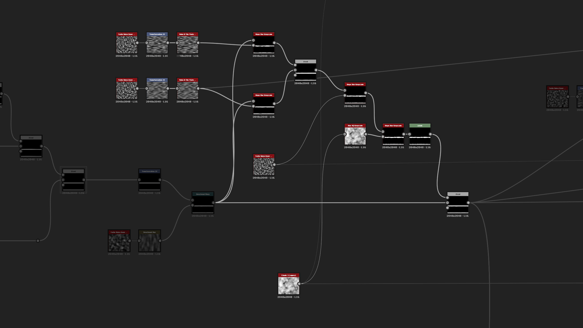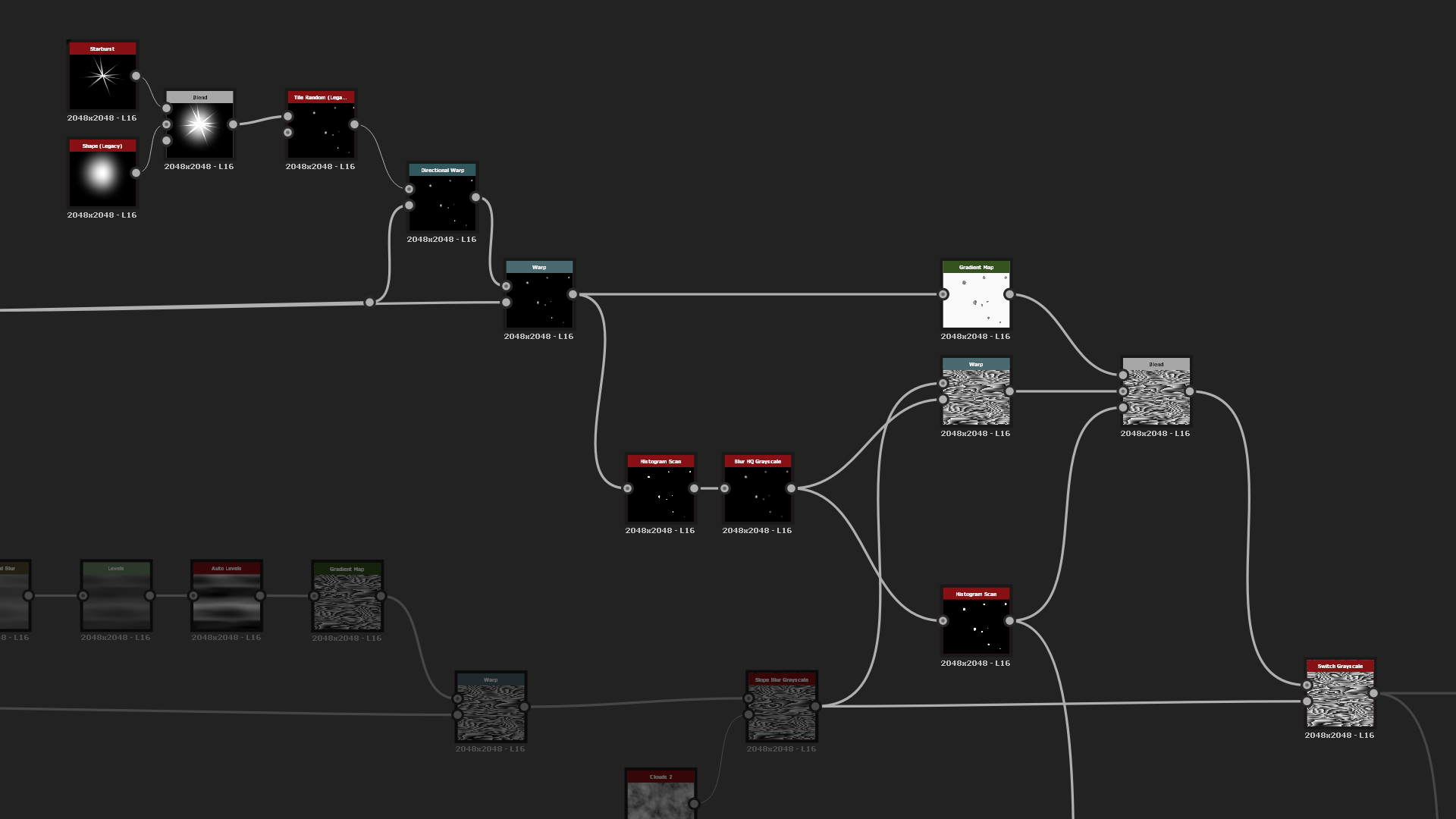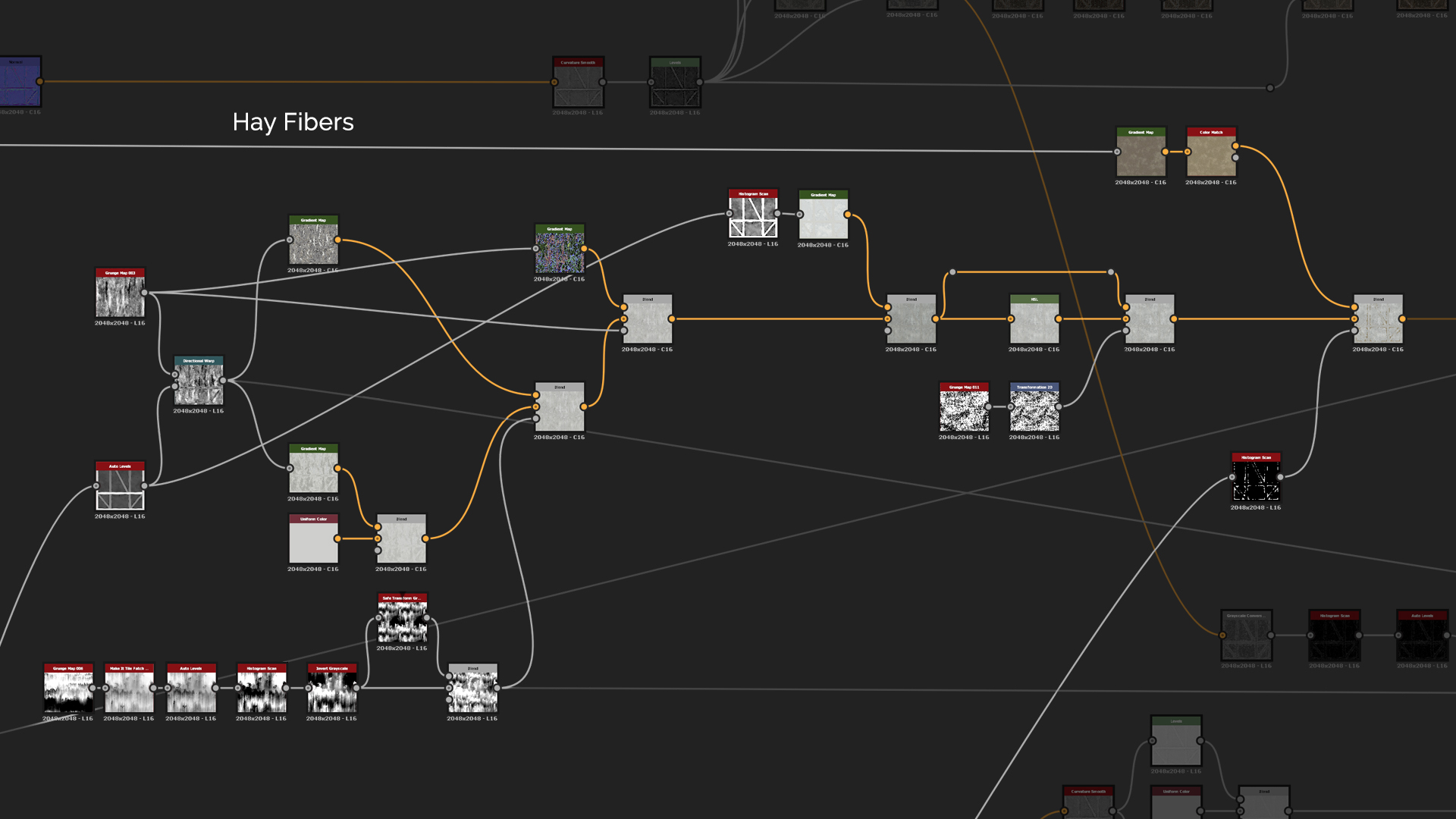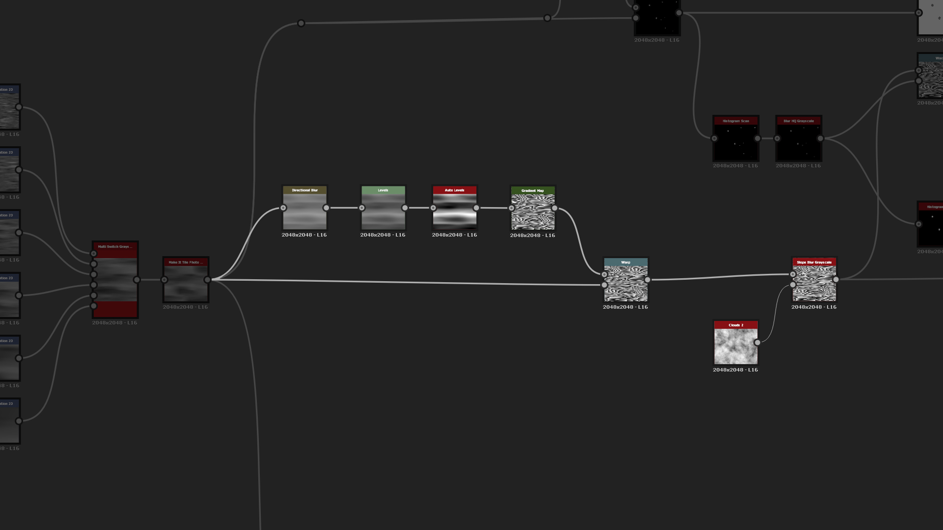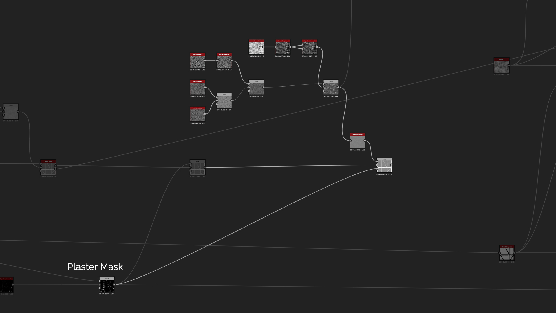 For more detail on the broken off plaster areas, we want to add hay fibers into the mix. To do that you can create a bunch of Messy Fibers nodes and mix them together with a simple Max Lighten blend mode and Multiply to add just a tint of variation to the height. To mask out random areas of the fibers, create another Clouds 2 that you invert and use Slope Blur to make it more uneven. The effect is again too strong so we need to add Histogram Range to soften it and blend them in by using a simple Copy mode.