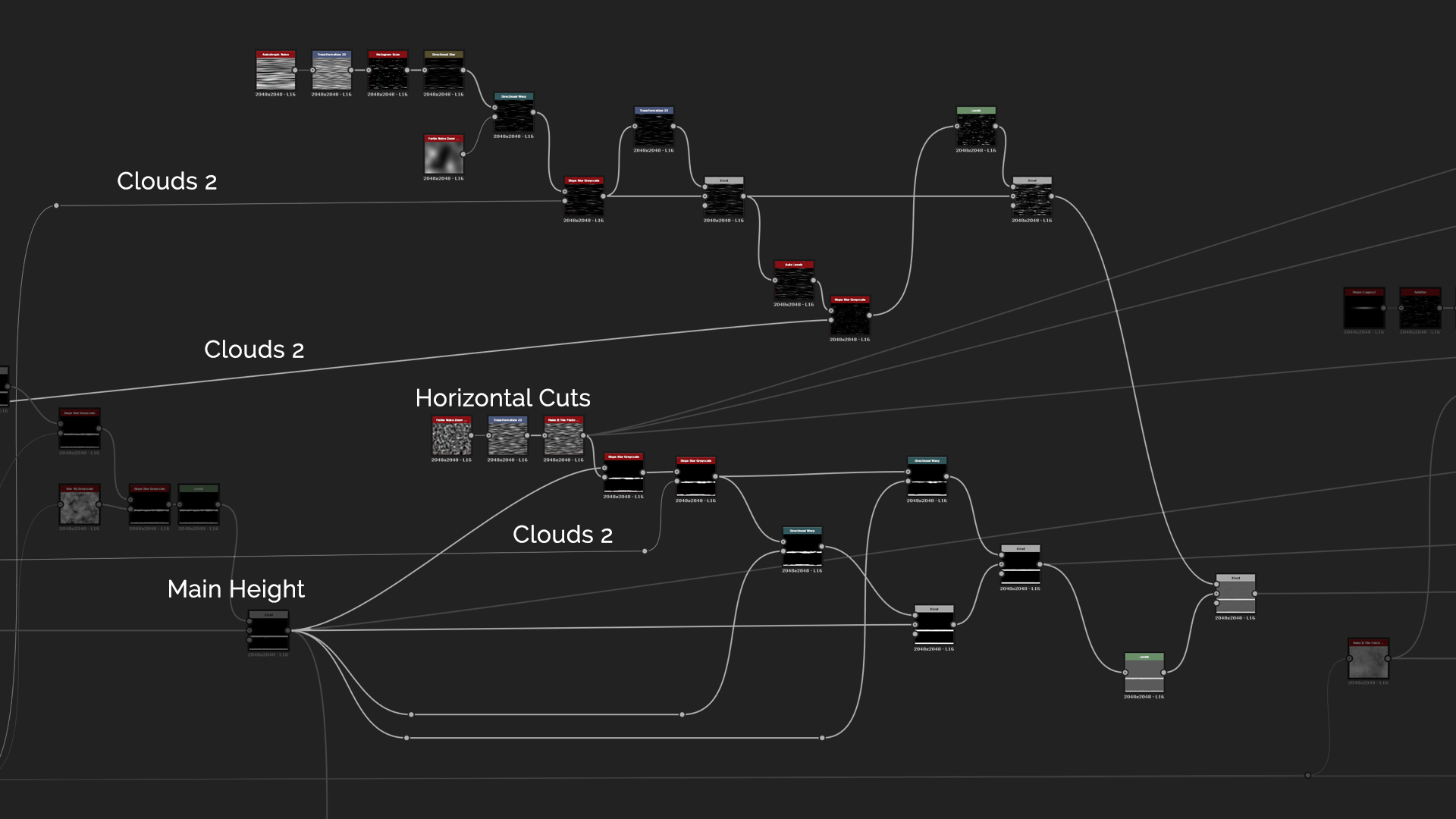 Since I started to like the idea of having cuts in the wood as if it was really dry, I wanted to emphasize that. Make a Shape of Ridged Bell and reduce the X size. After that plug it into Splatter and use Histogram Scan to mask out some of them. Then use Slope Blur with the Horizontal Cuts noise and Clouds 2 to add some wearing effect to the cuts. Clouds 2 went through Make It Tile node to reduce the noise pattern which is quite heavy. You can then end the cuts by warping them to the Main Height and Perlin Noise to randomize them a bit more.