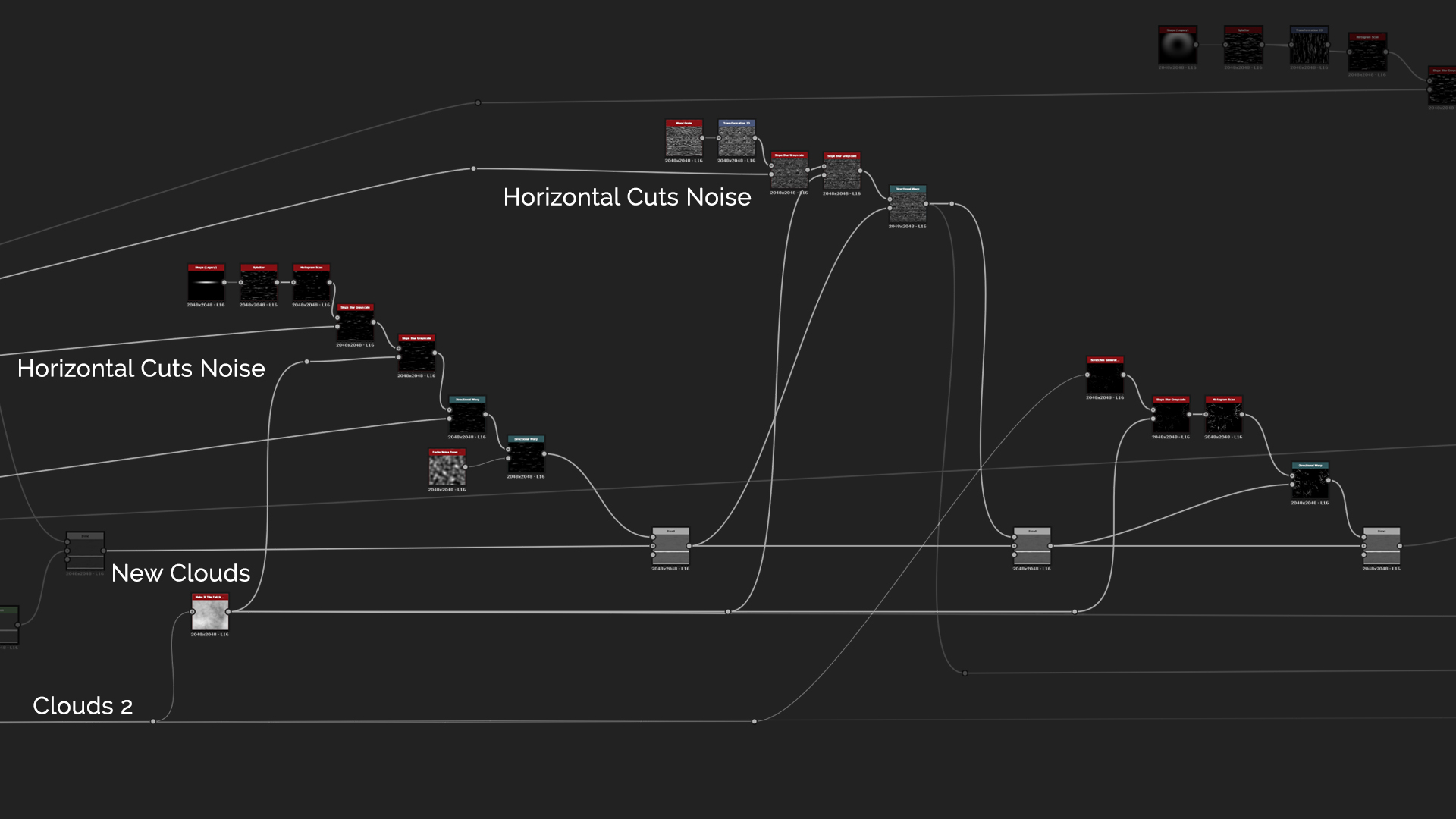 After the Wood Grain details and cuts we want to add some irregularity dents into the wood. But before that we can make a simple Scratch Generator node where we use New Clouds as a mask and generate few scratches that go through Slope Blur for some wear effects.