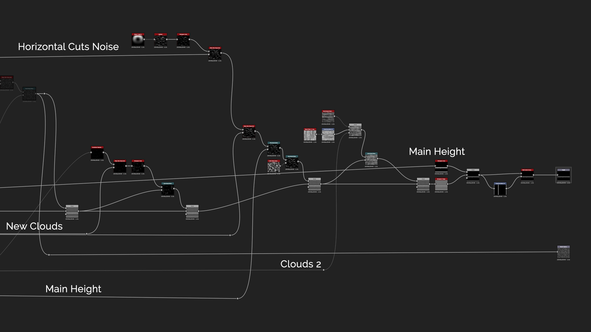 Then, you can name the "Main Height" blend node as it will be used later on and might be too confusing to explain where it stands in the graph. In the first blend node add more horizontal edge wear since the previous one was using more as a cut-in wear effect. You can use the same technique with Vertical Noise and Slope Blur that was just used. And of course also add some Directional Warping so the details will flow correctly to the Main Height. After that we want to add some horizontal cuts along the beams. Start again with Vertical Noise, rotate it to be horizontal, separate few lines using Histogram Scan and stretch them using Directional Blur. To add some warping use Slope Blur and blend them in by using Subtract mode with very low intensity of 0.05. These parameters could be Exposed so you can tweak them to the corresponding material as needed.