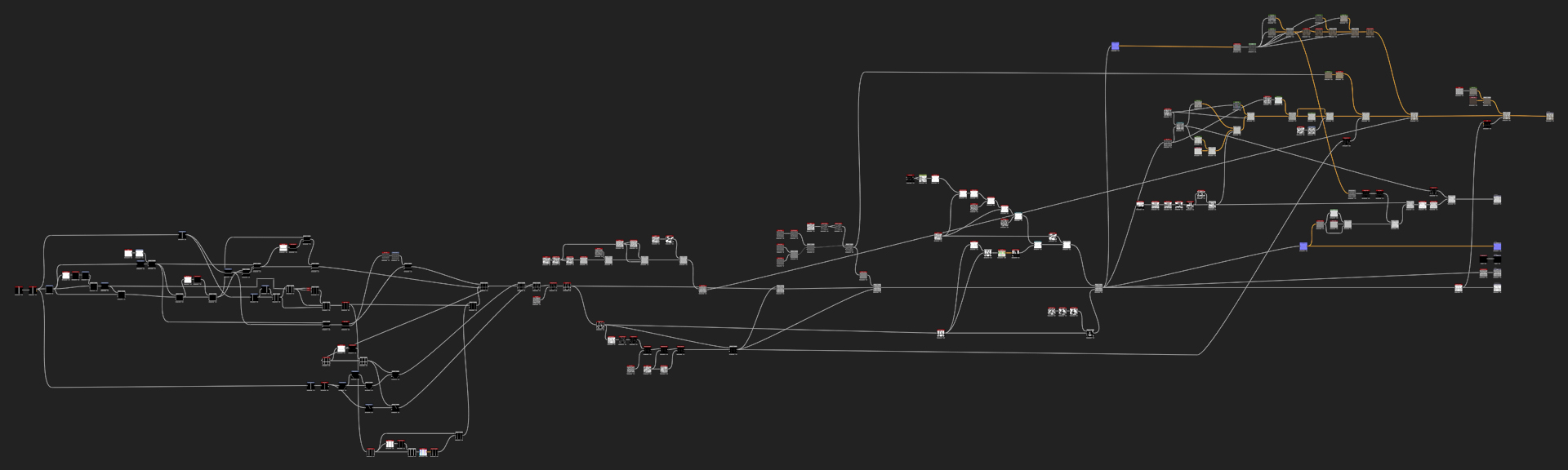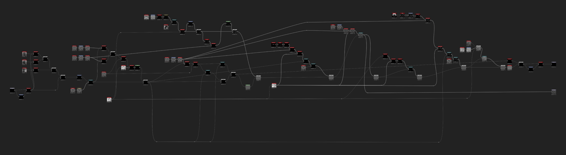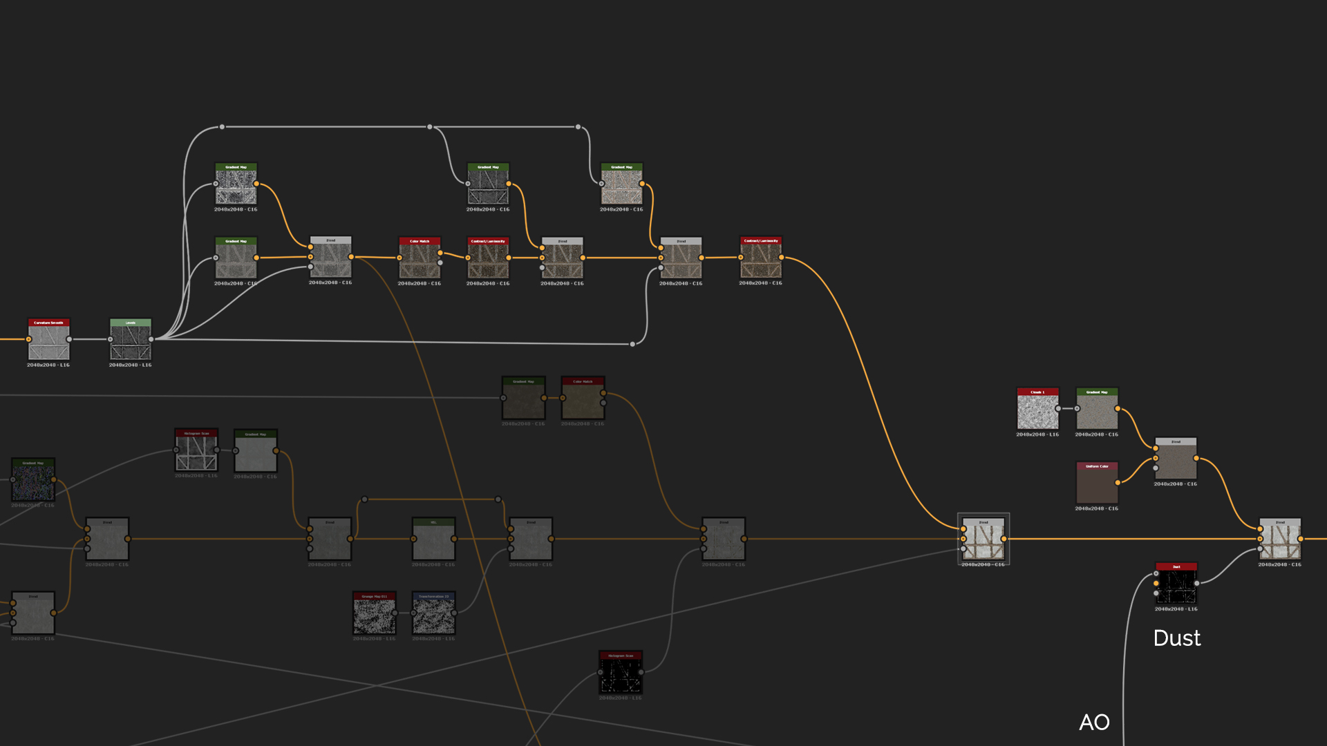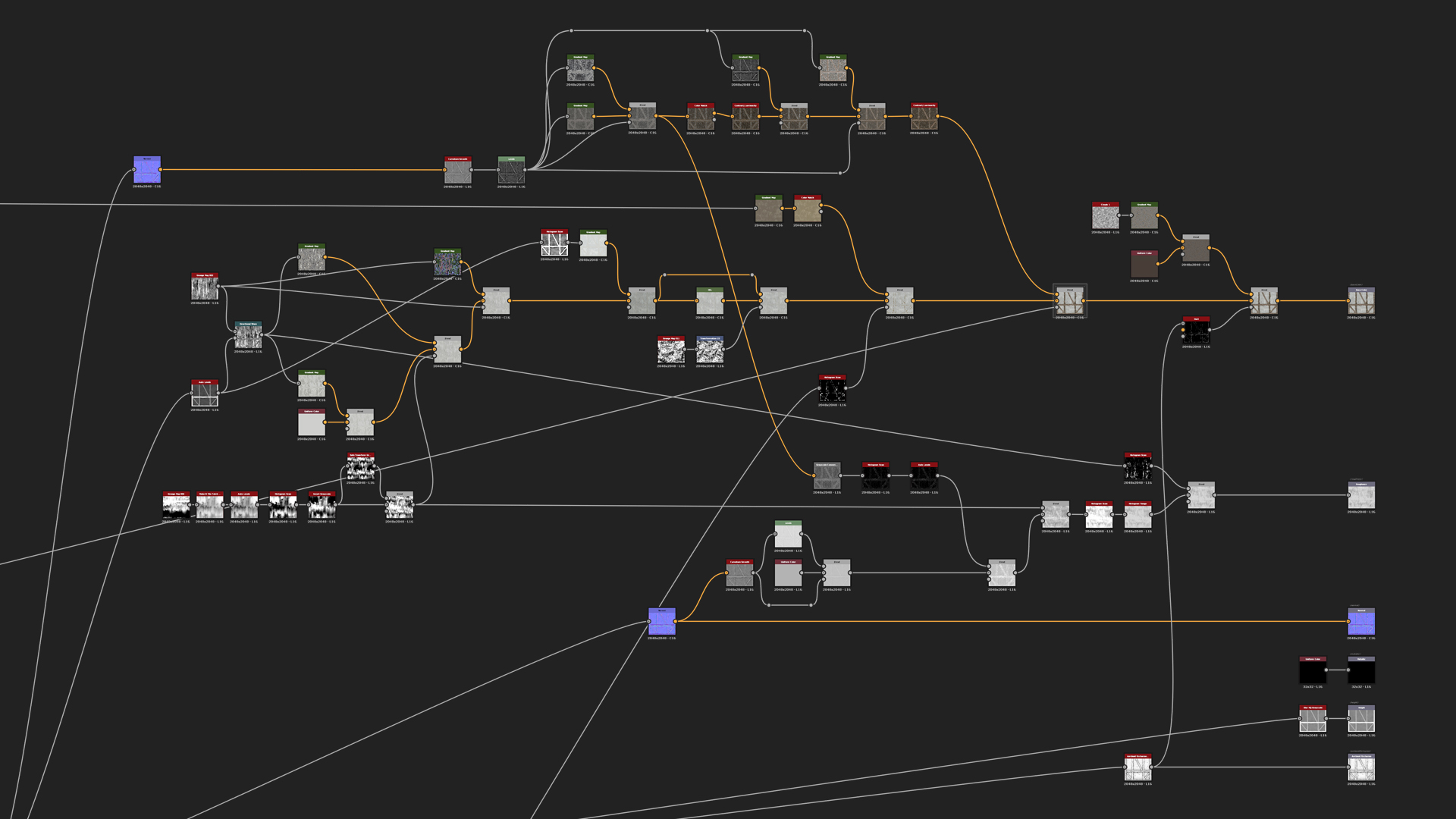 Fortunately the Base Color is fairly simple too even if it looks complicated. For the wood we have to create another Normal node so the graph will be easier to read. That runs into Curvature Smooth that runs through different Gradient maps. For the plaster use the Grunge Map 3 that was warped around the final height and goes through the same flow as the wood by using different Gradient maps that are picked from the reference images. In order to add some leaking effect to the Base Color and Roughness, we can use Grunge Map 6 that runs through Make It Tile Patch where Octave is on 1 and the Pattern Width & Height are increased. Then also add Safe Transform to tile it a bit more and blend both of the leaking effects together using Max Lighten mode. Blend all the different colors together using the mask generated before like one from the Height Blend and Plaster Mask. And for the final detail add some dirt with Dust generator that comes with Designer.