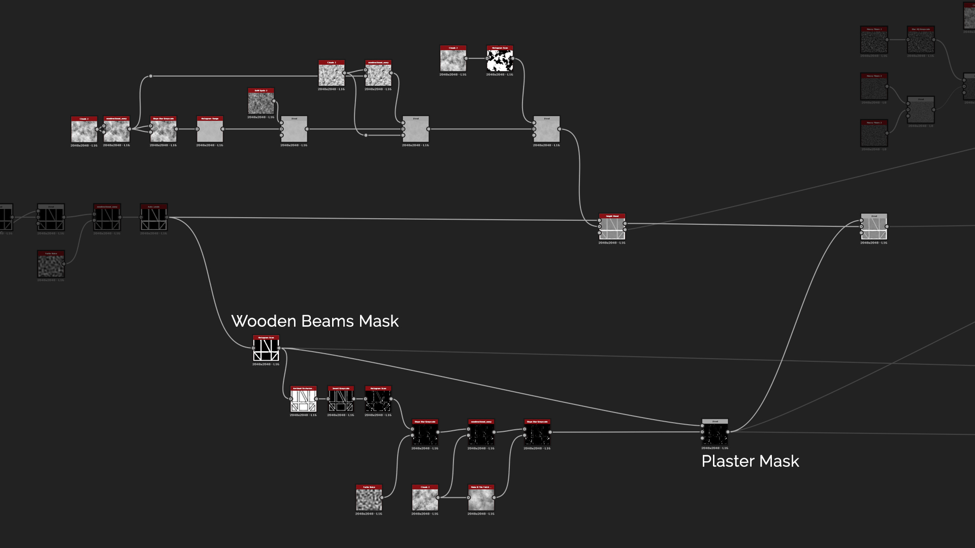For the plaster you can start out with Clouds 2 and warp them with Non-Directional Warp and Slope Blur. Here we want to make the plaster look really worn out and as if it was done using the most basic tools. After that use Histogram Range to soften up the height since it is too heavy. Then you can add micro details with BnW Spots 2 noise with very subtle blend of 0.0023 and layered feel to it by using Clouds 2 and Histogram scan that is clamped to full black and white. For the final blend between the Plaster and Wooden Beams, use Height Blend node. The great thing with that node is that it generates out mask between the two layers that comes really handy in the coloring phase.
