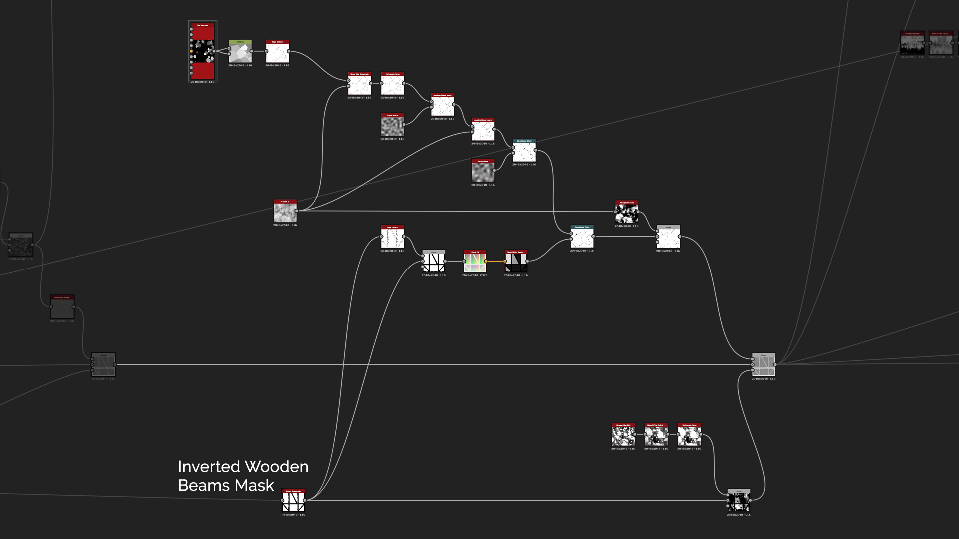 We will then create a Wood Pattern generator that adds edge wear, irregularity and wood grain details to the input. For the inputs, use the final Wooden Beams, then you will only have to make a square shape and the generator makes all the details needed for the beams. That way you will be able to use Transform2D in any way you want and just have to run it through the generator and all the details will be transformed the same way. Good example about it is if you imagine 45 degree plank and adding wood grain, edge wear and details to that. Rather than rotating multiple nodes if changes are needed, then you will be able to do that with only one node. It saves time and your graph will be well organized so it will have better readability.