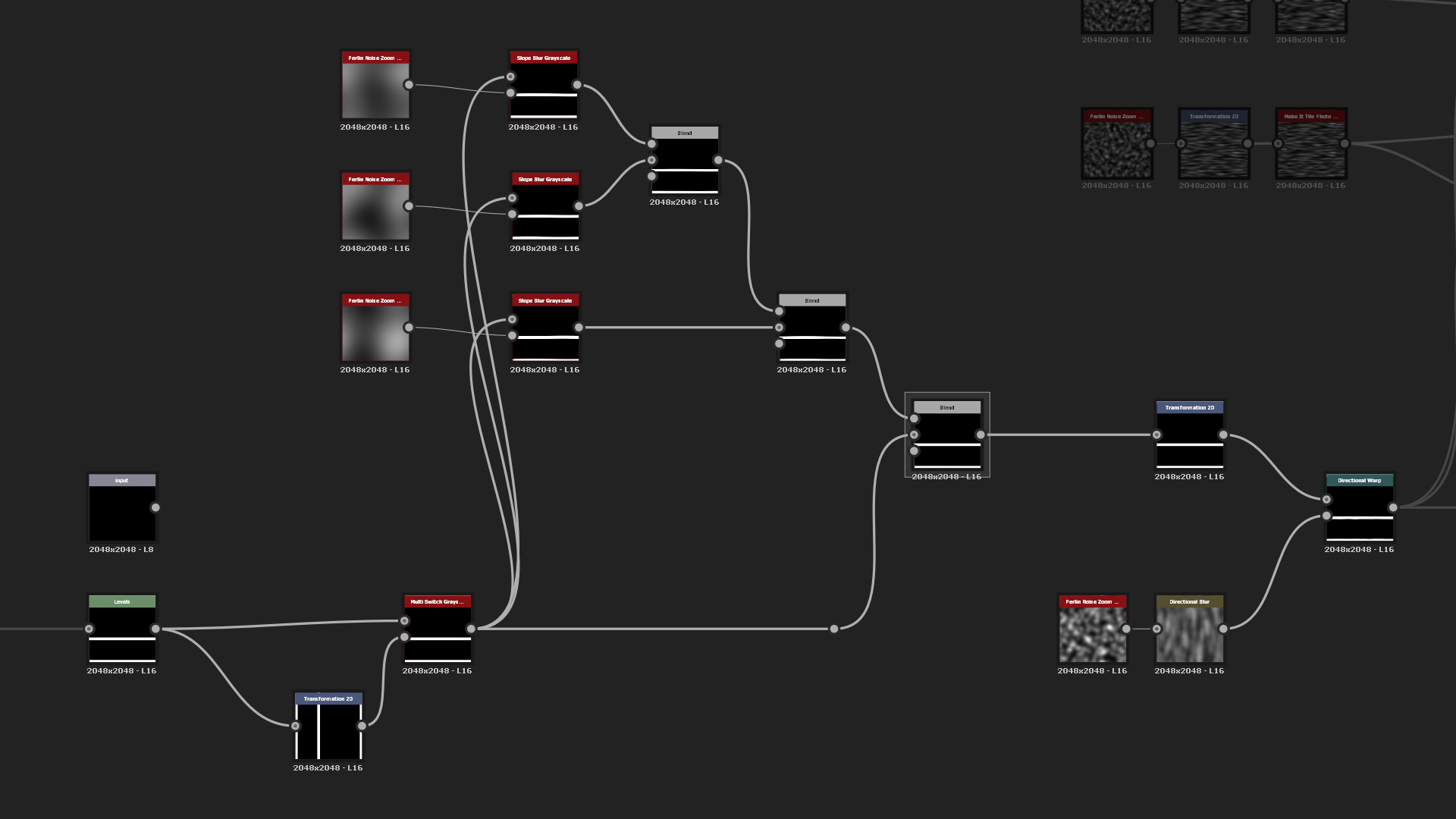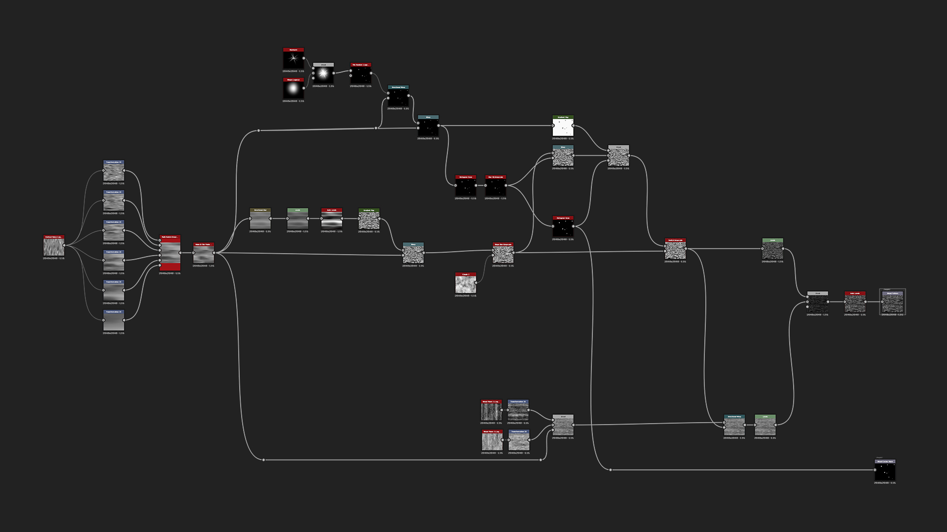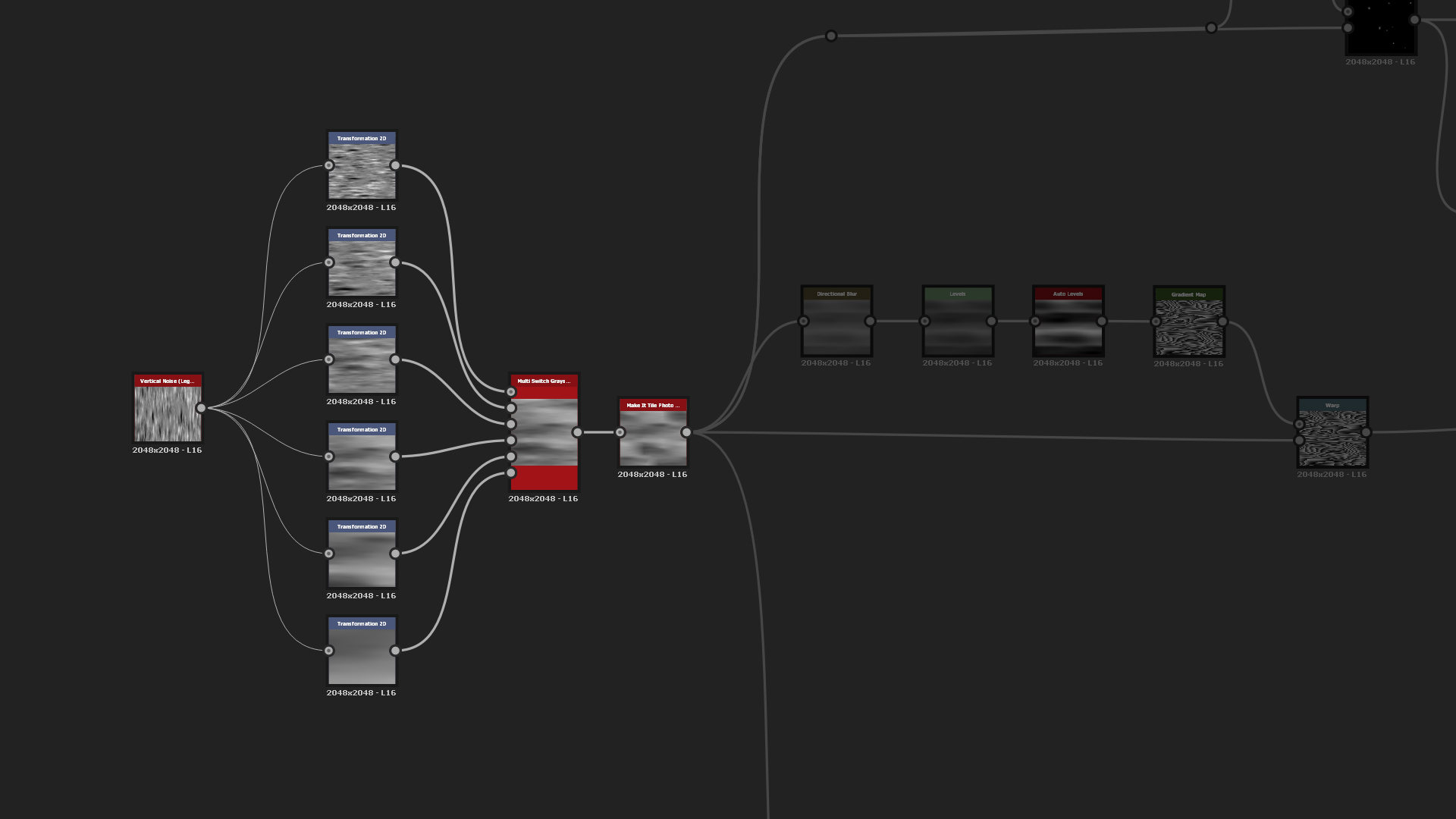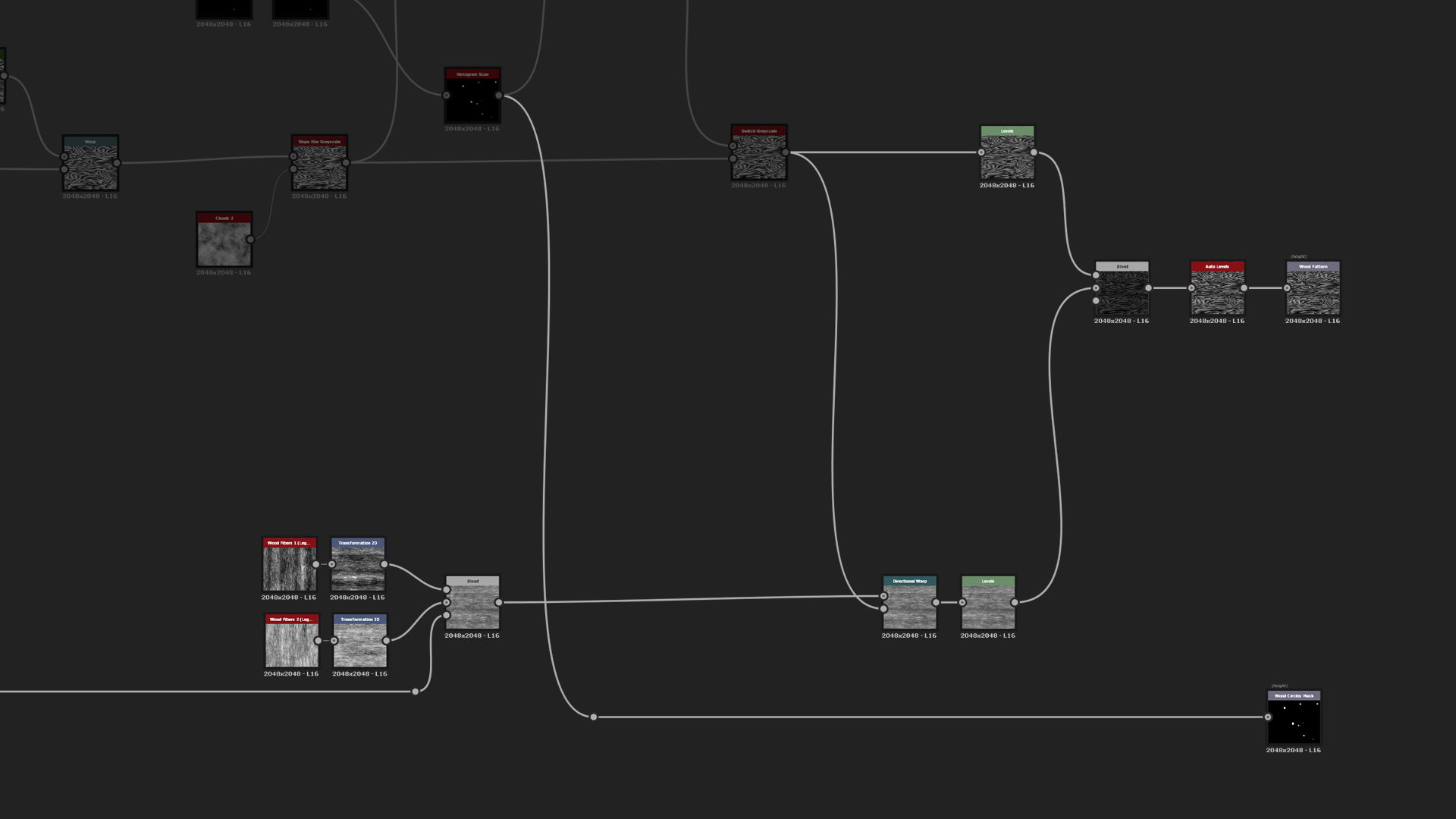Final step for the wood pattern is the micro details. There use the Directional Noises (or Wood Grain from legacy), warp them to the horizontal lines and blend both the wood detail grain and pattern together using Multiply blend mode. After that you can add Auto Levels to clamp from maximum black to white. Then add two outputs - one for the main Height and second for the Wood Circles mask which can come handy when they are needed to be colorized differently.