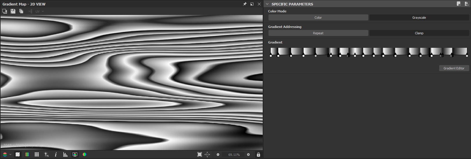 You can then use Directional Blur, Levels, and Auto Levels to clamp the values of the horizontal lines. And now run it through Gradient to be able to manually assign gradients to different slopes of the horizontal lines and create the Wood Pattern. To finalize the pattern, use Warp and Slope Blur with very low intensity, just to add some extra details and warpings to make it look more organic with small wood splinters.