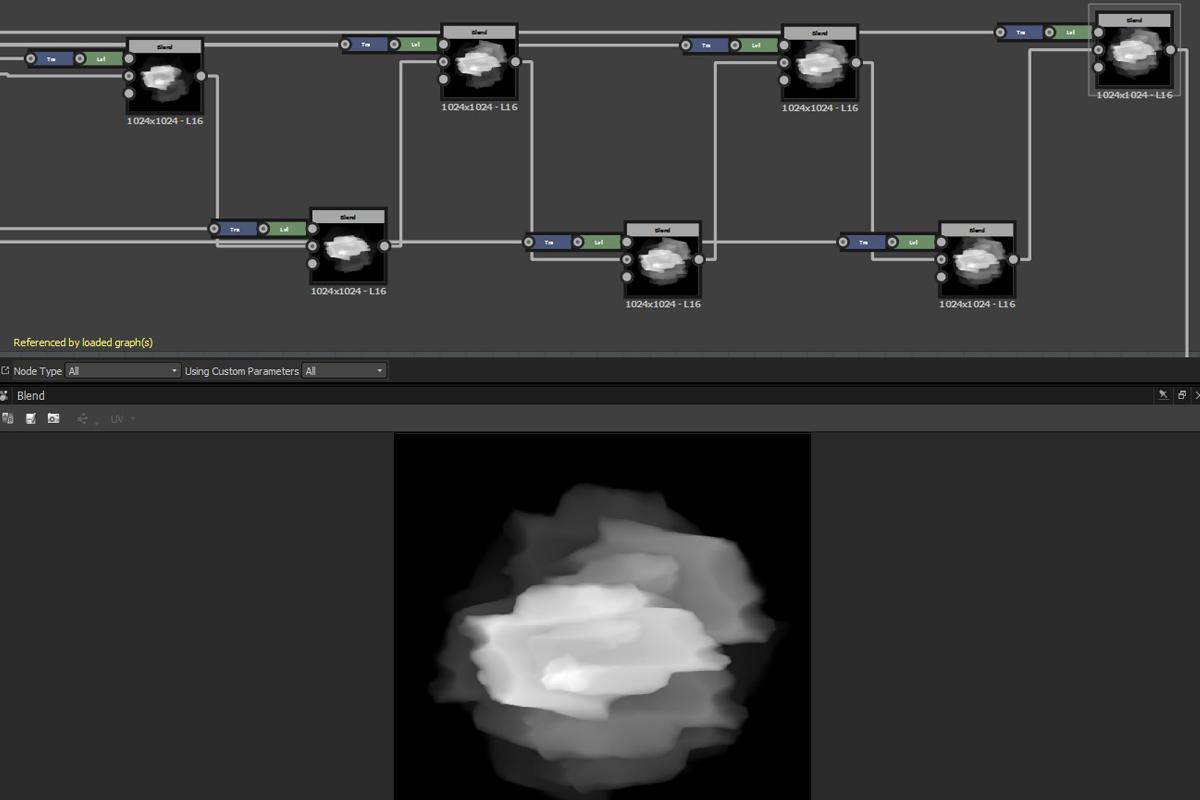 Now that I have my rock primitive shape, I use a succession of blends to merge them together. The Transformation 2D nodes allow me to place the shape in the right position. The Level nodes are here to adjust the elevation of the two shapes blended in Max.