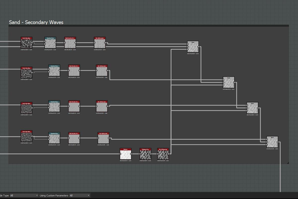 To add more variations to my sand, I made a copy of my first dune graph, and changed the orientation and tiling of my gradients.